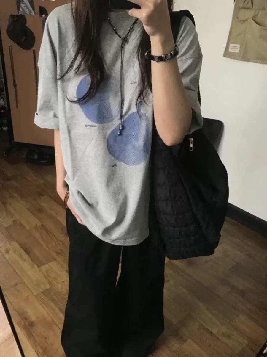 グレーにブルーのりんごが可愛らしいTシャツ。