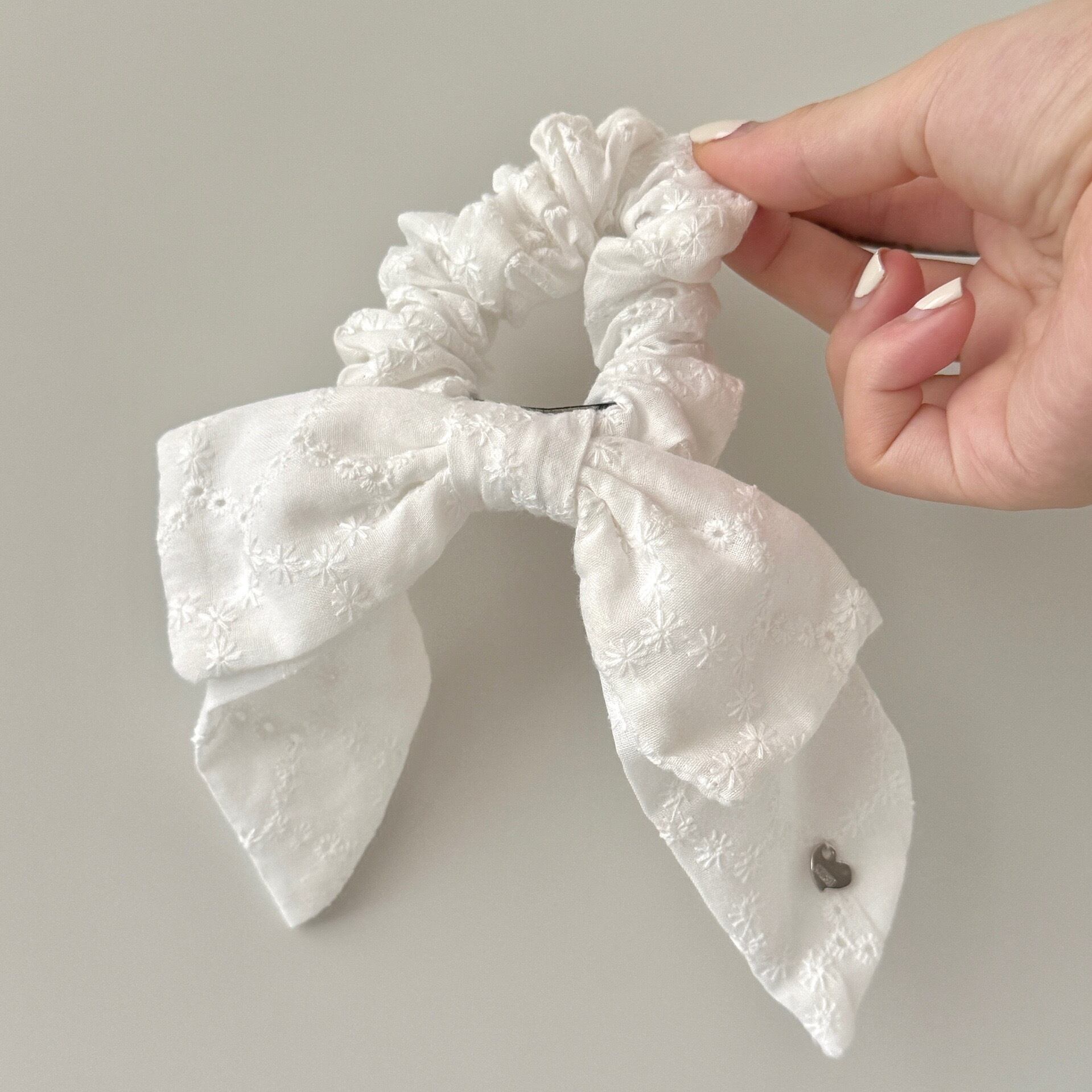 小花柄のコットン生地が可愛らしい印象を与えてくれるリボンシュシュ。
