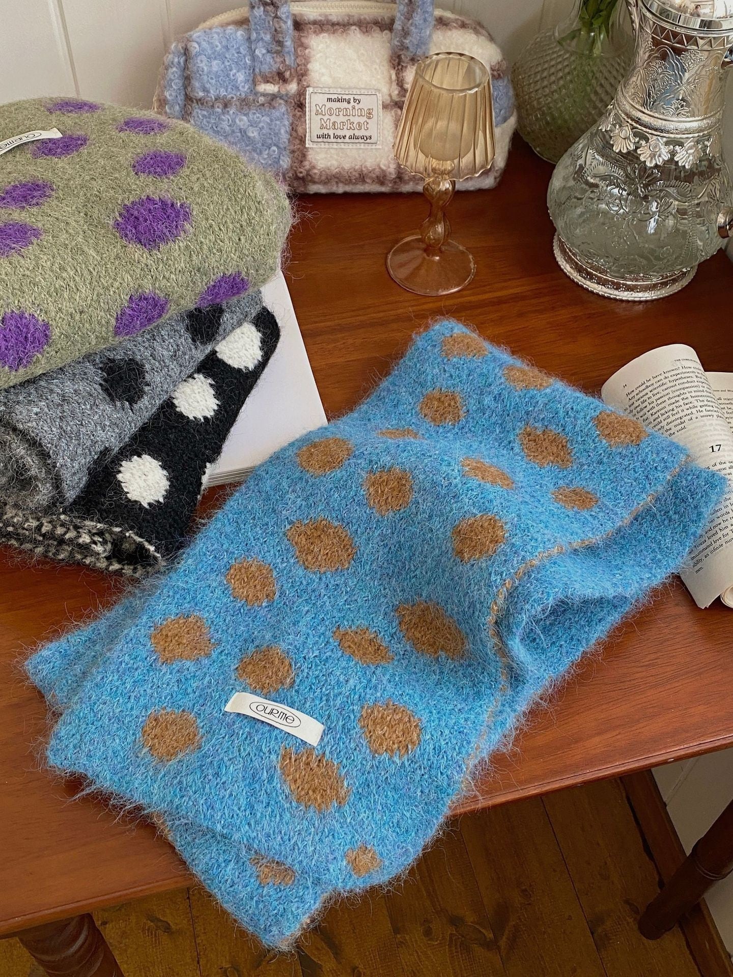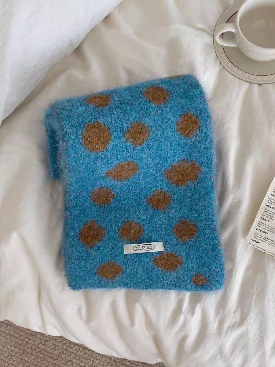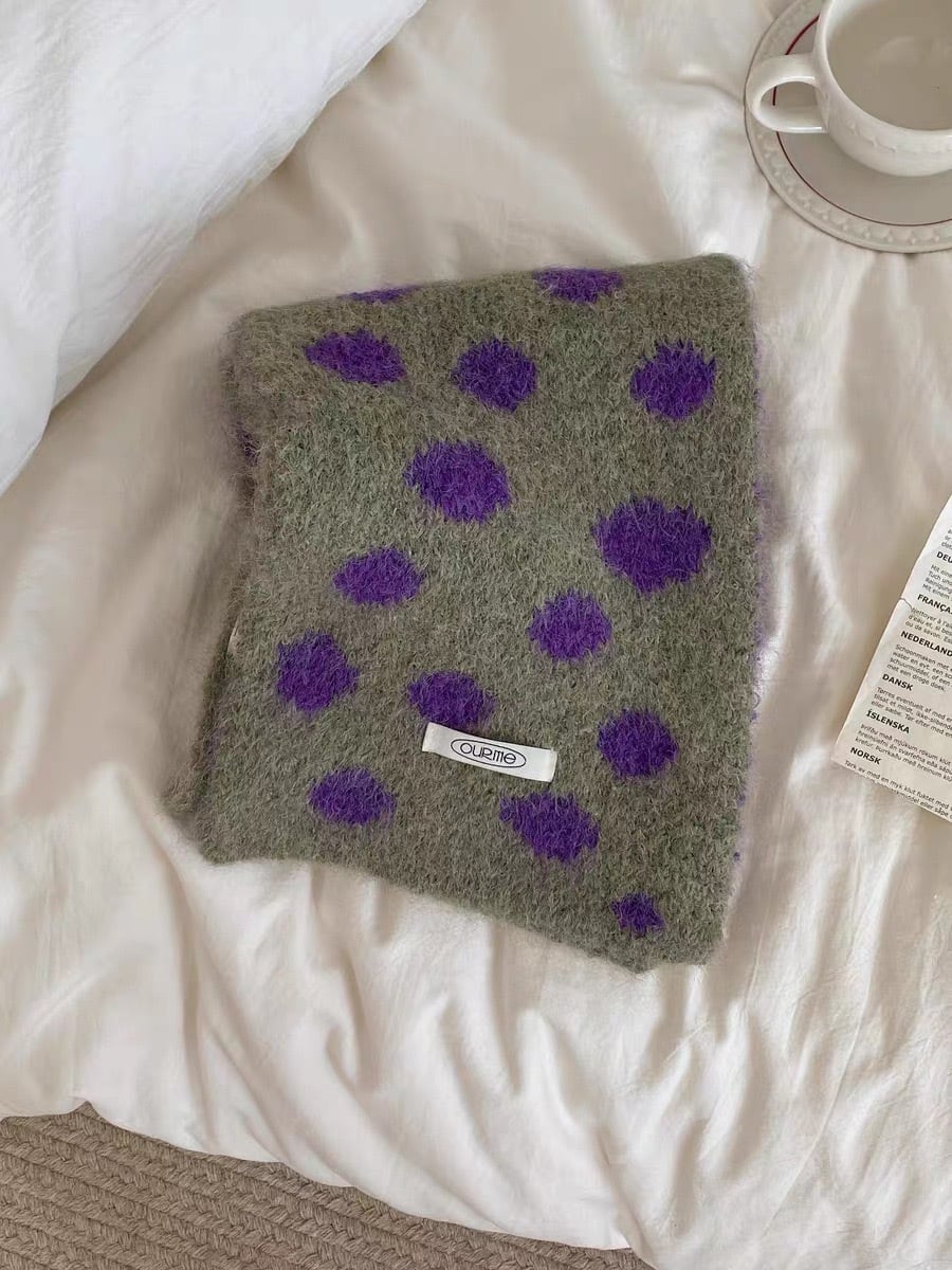 不規則な大きめのドット柄がポップで可愛らしいマフラー。