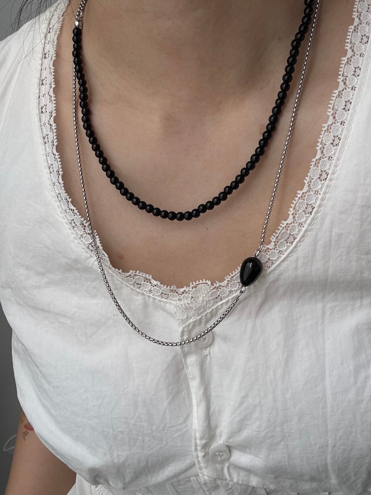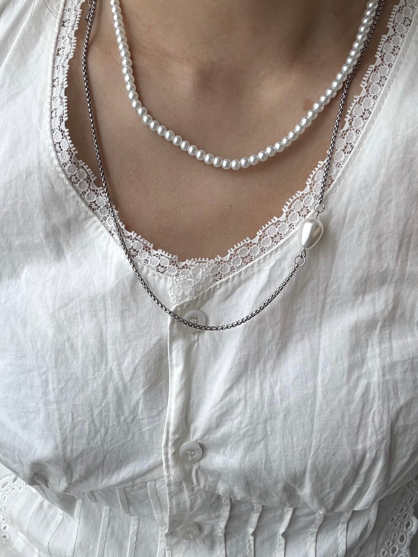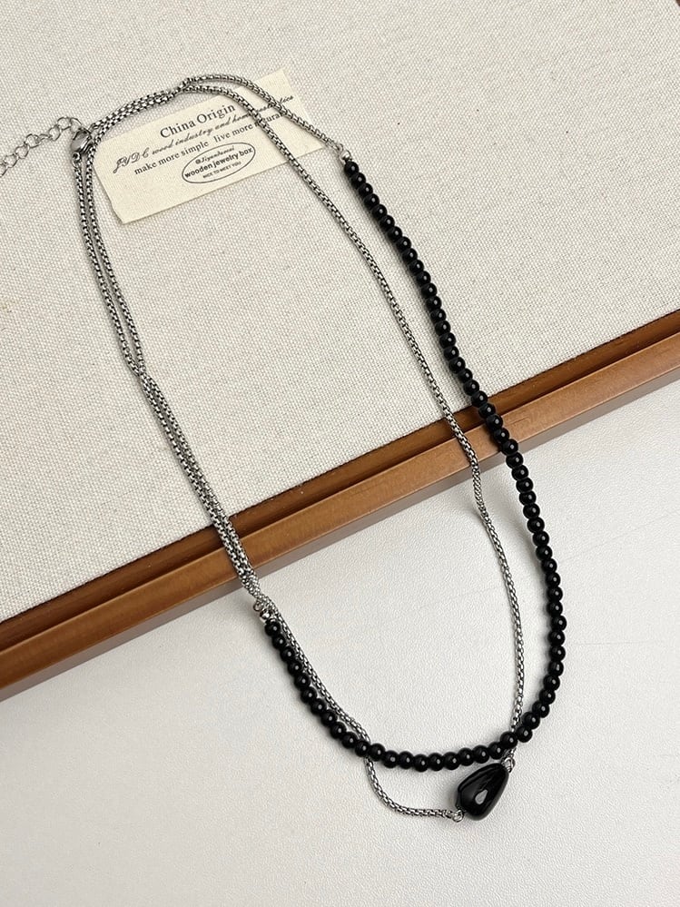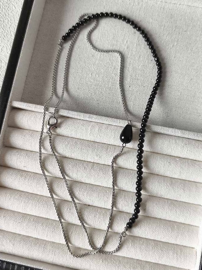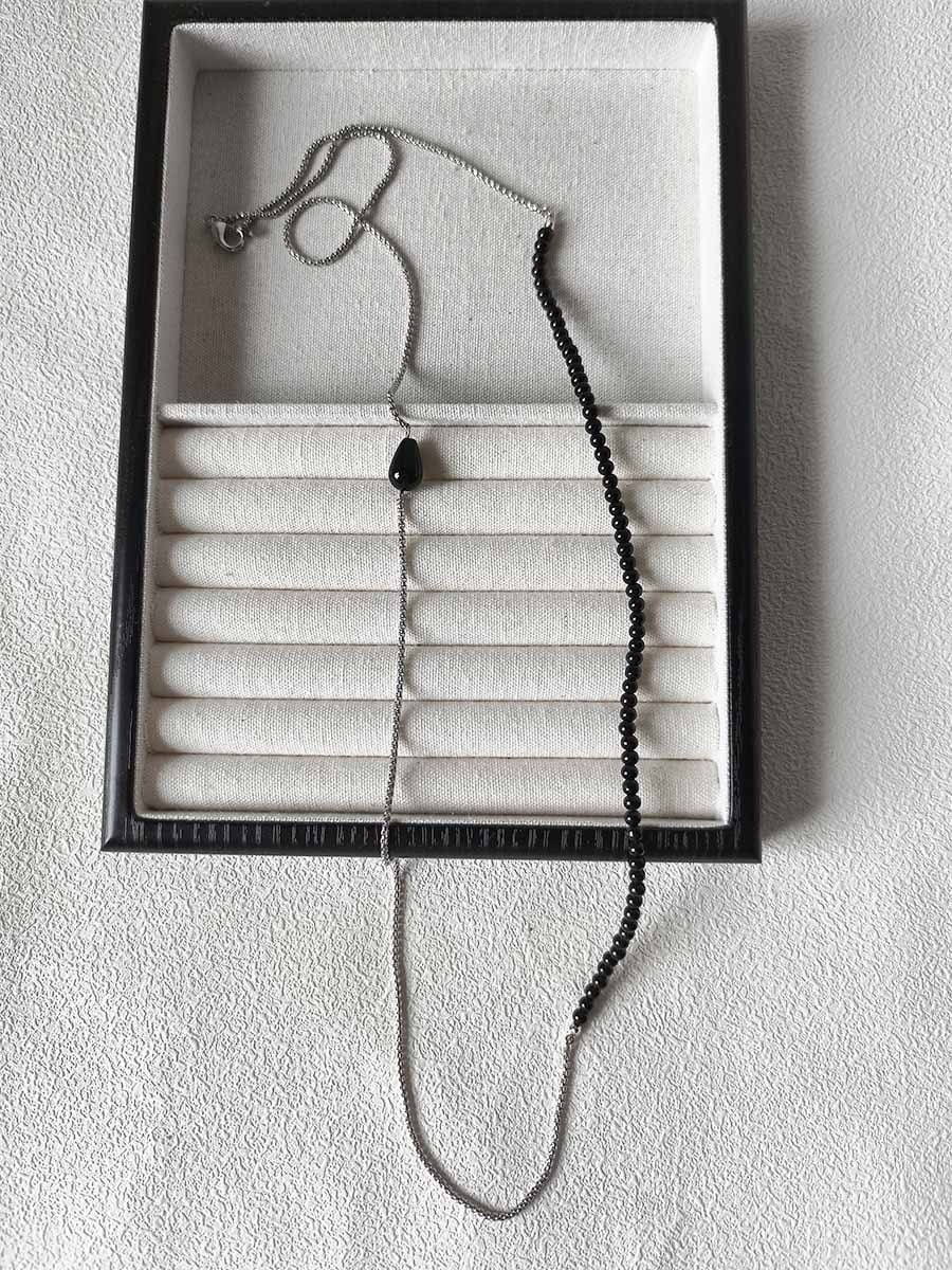 ビーズとシルバーチェーンの組み合わせがエレガントなネックレス。
