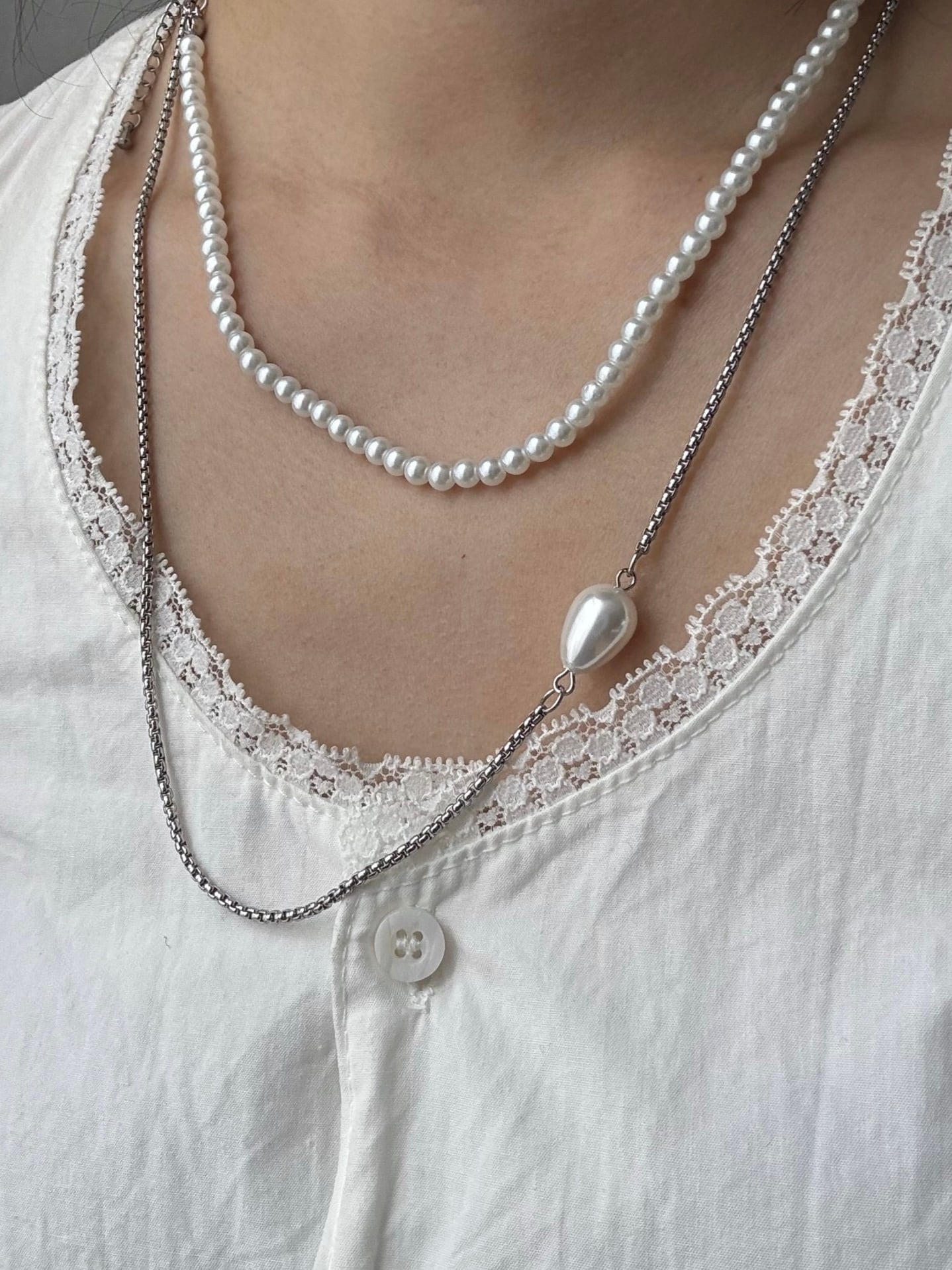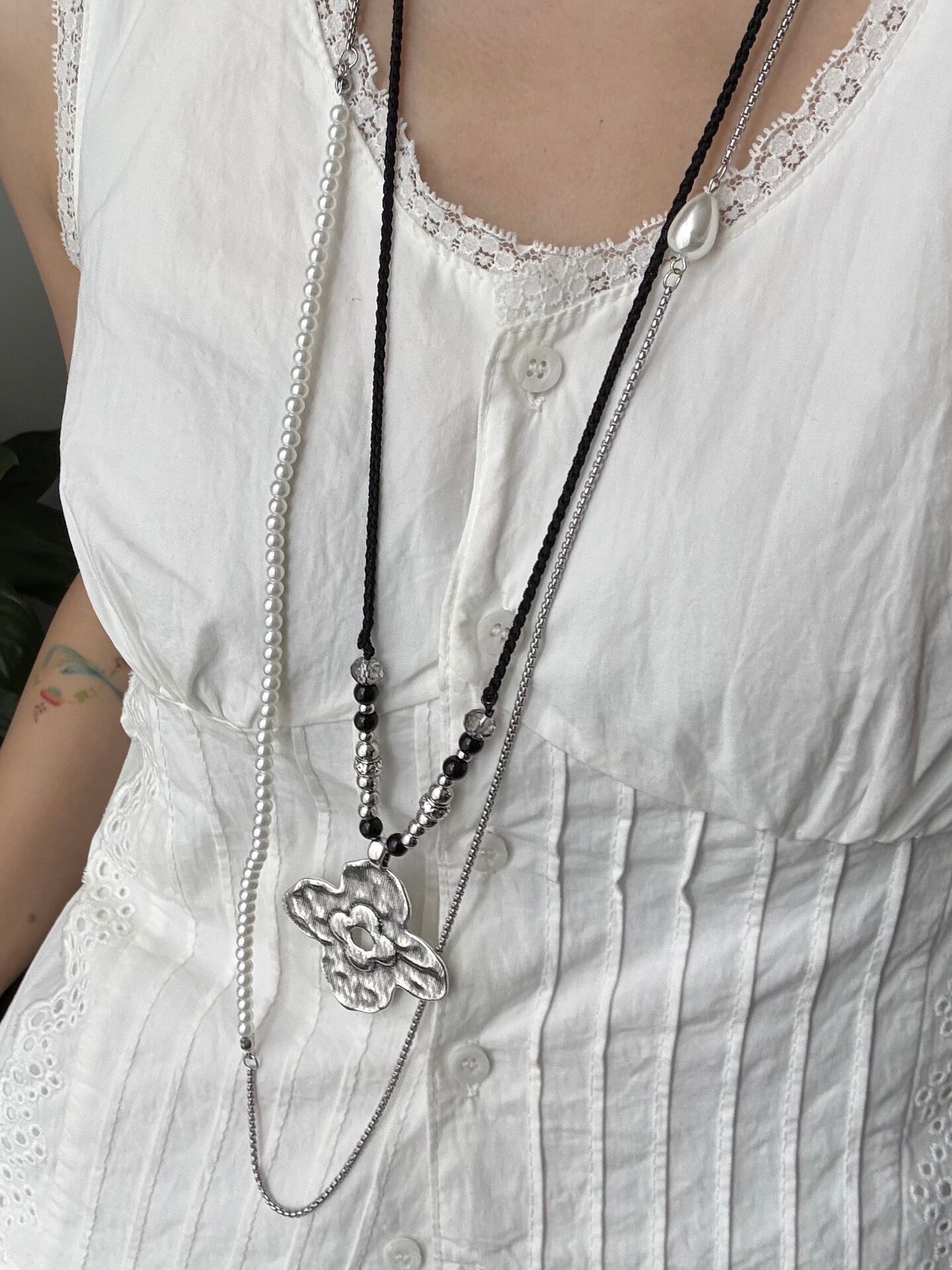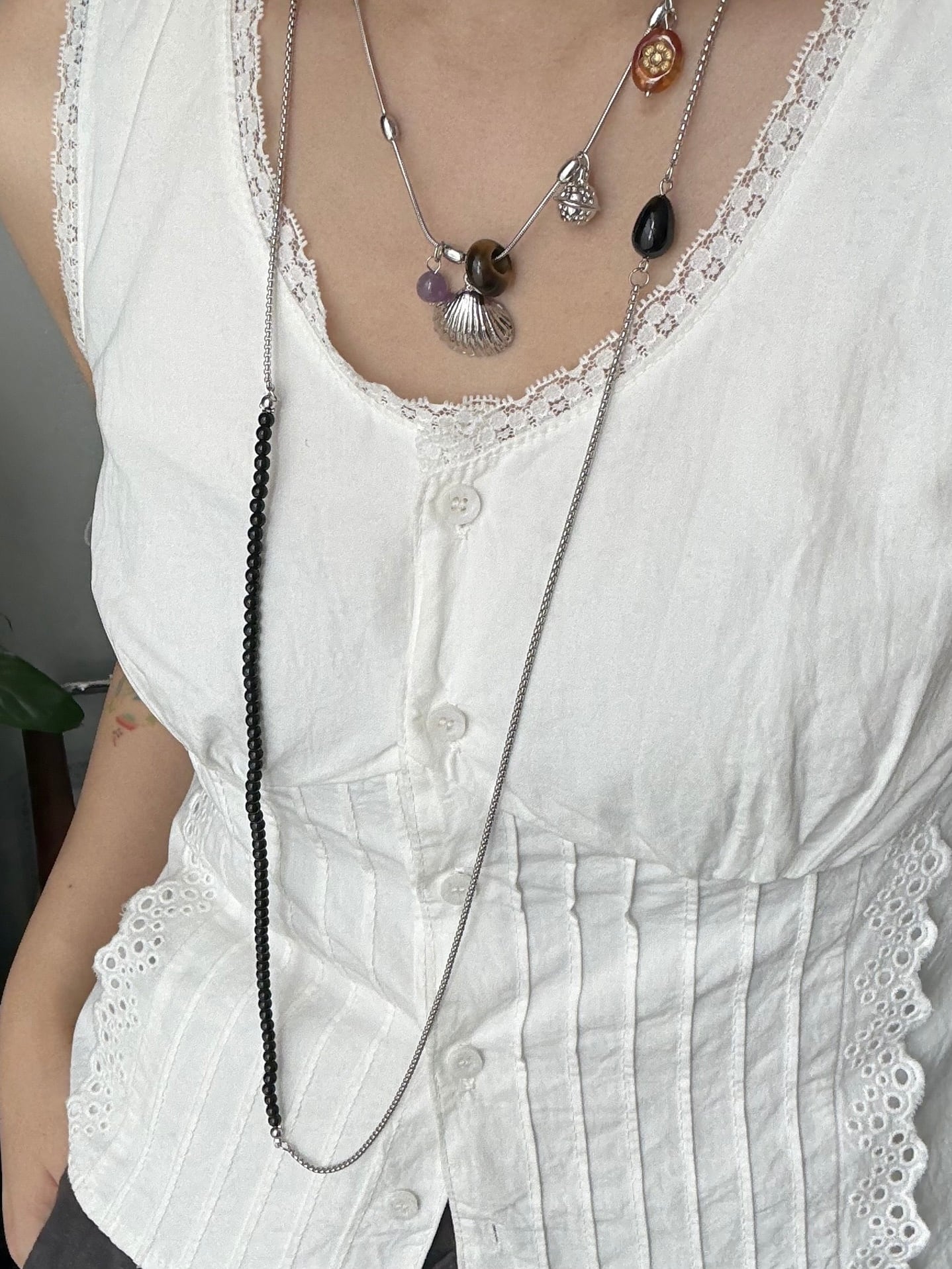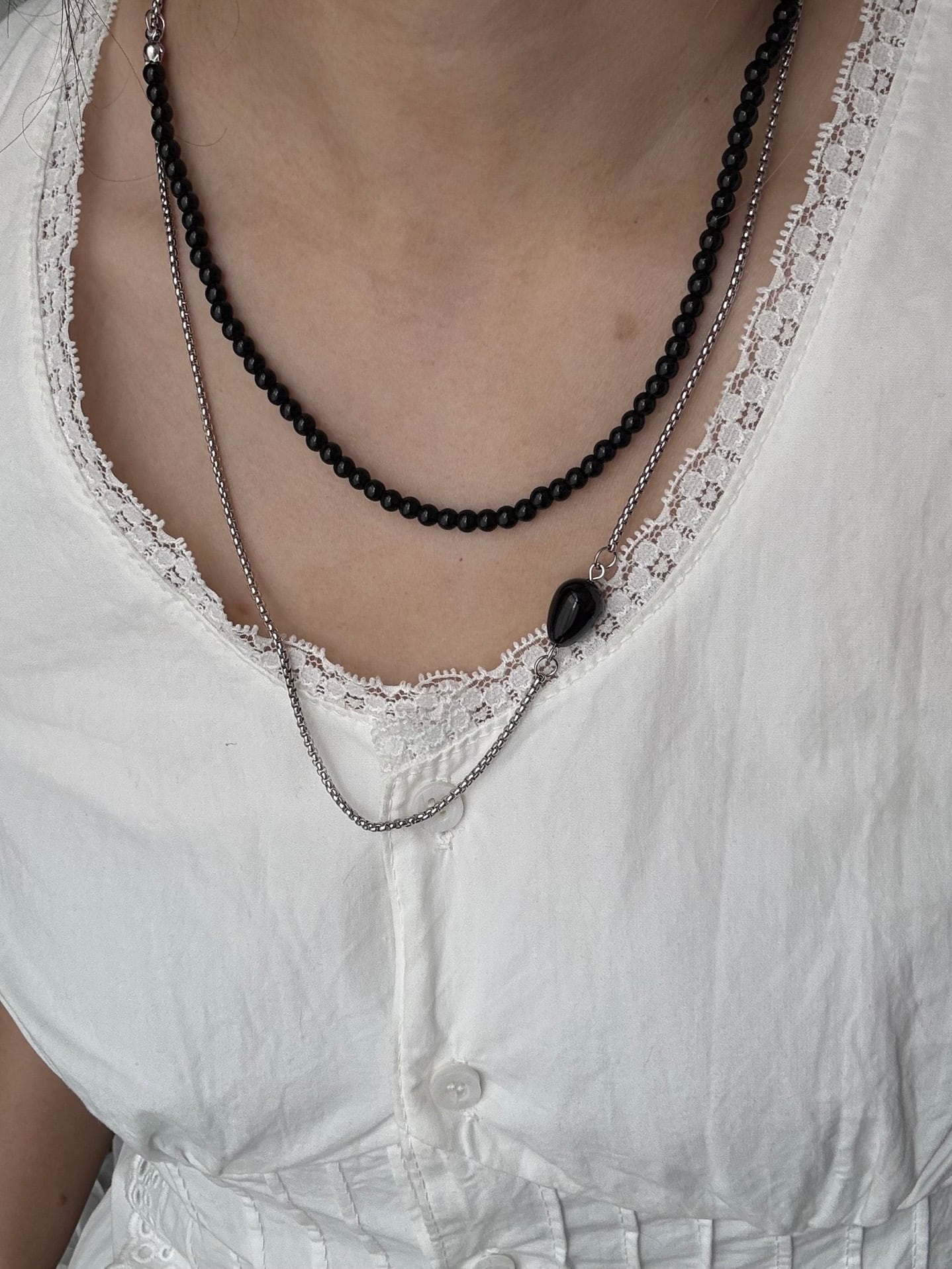 ビーズとシルバーチェーンの組み合わせがエレガントなネックレス。