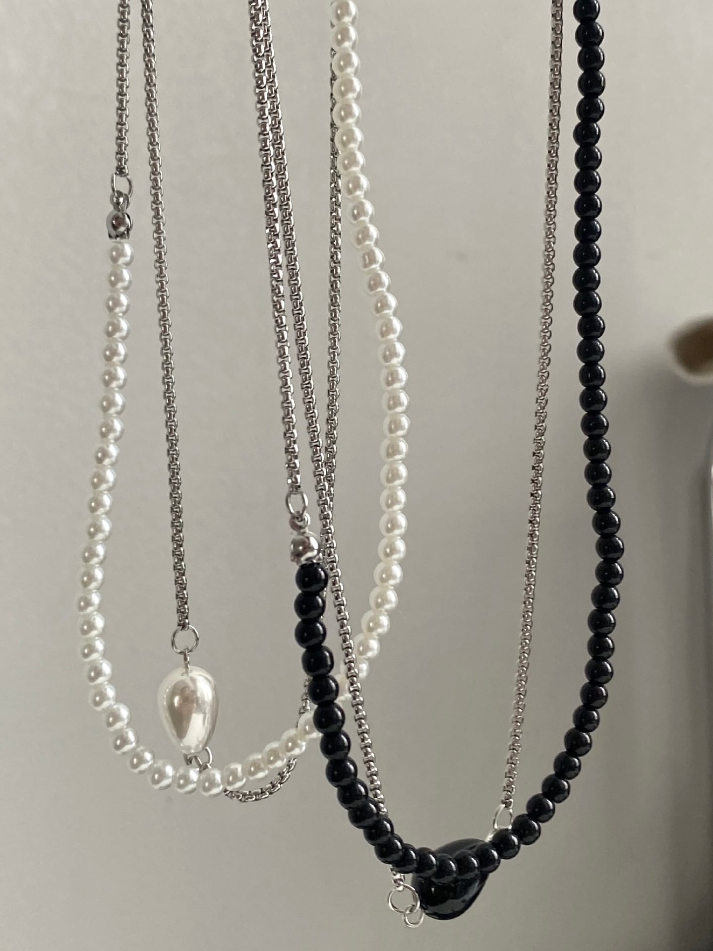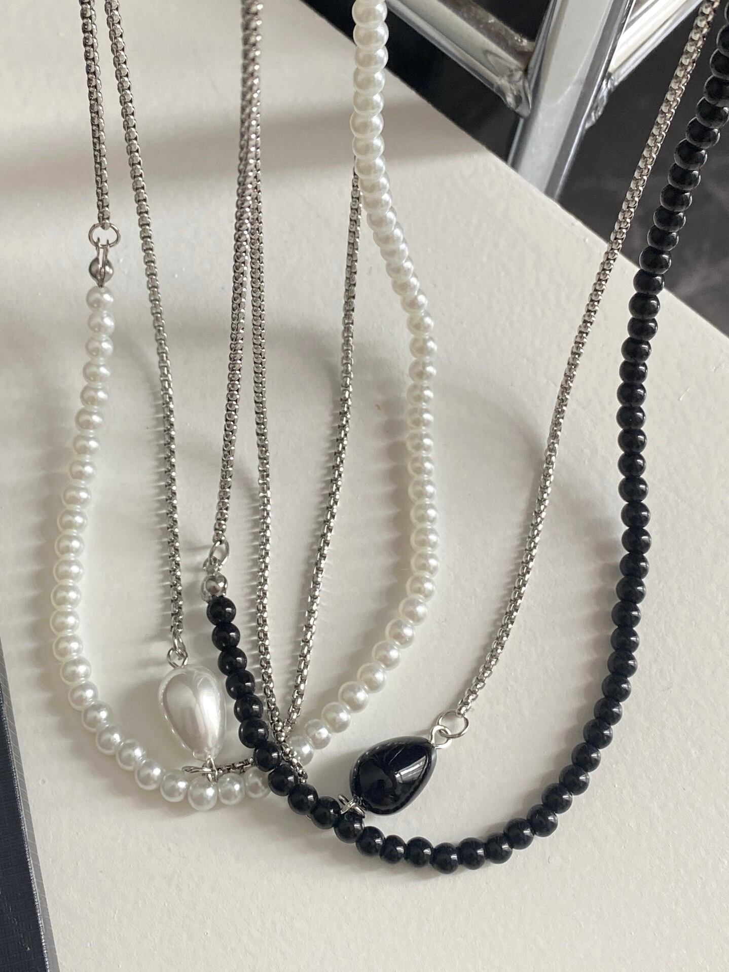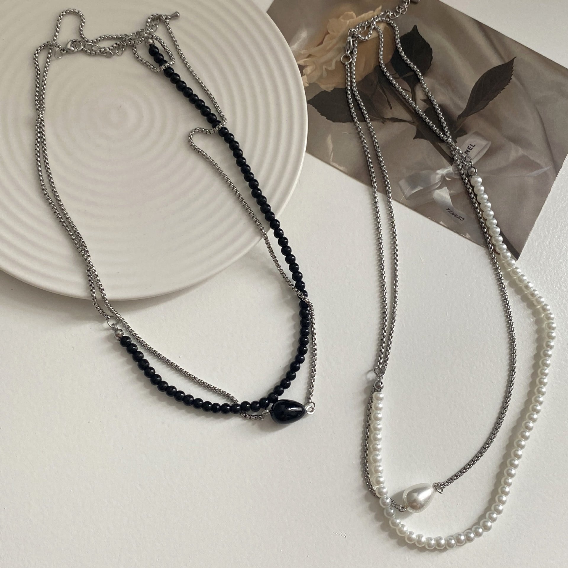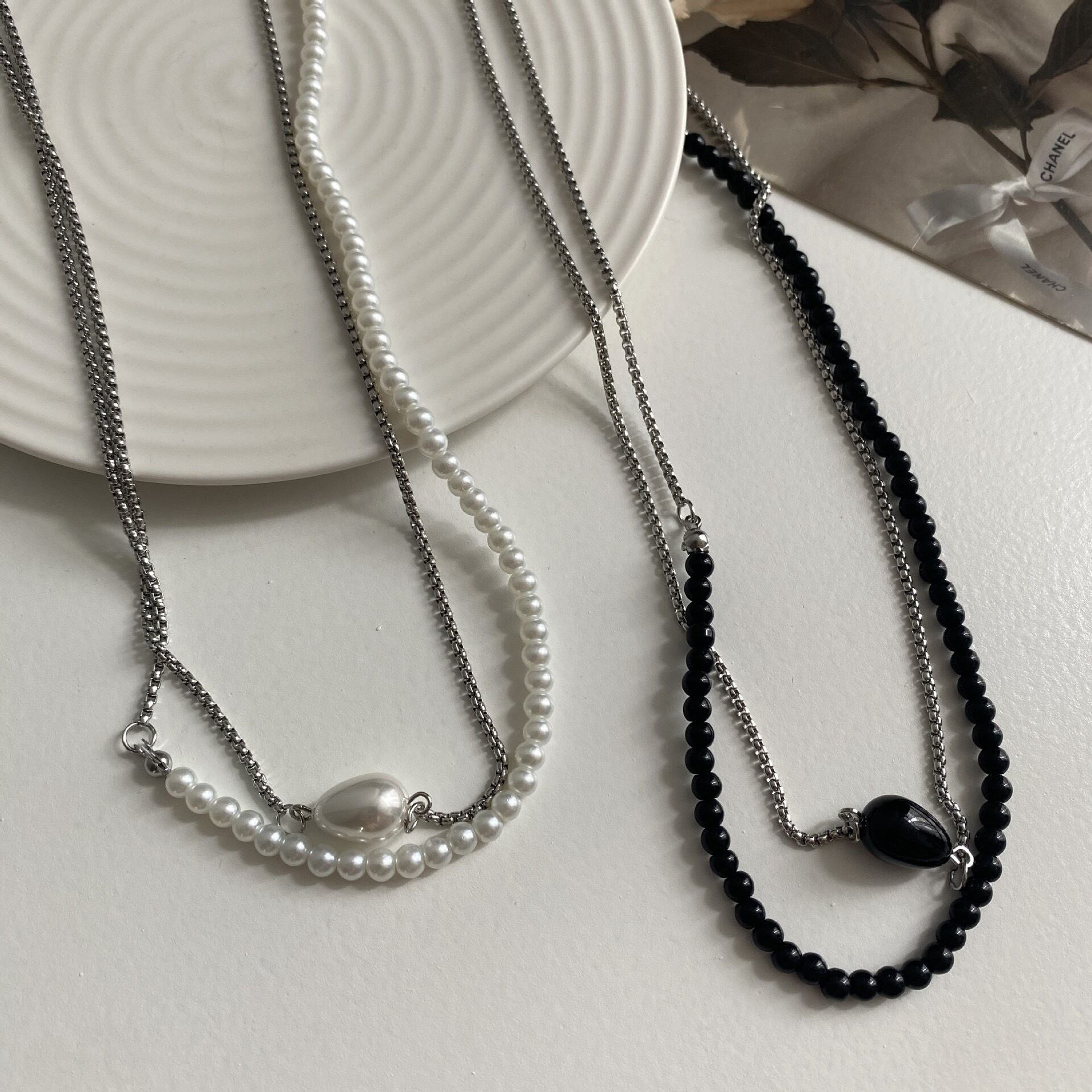 ビーズとシルバーチェーンの組み合わせがエレガントなネックレス。