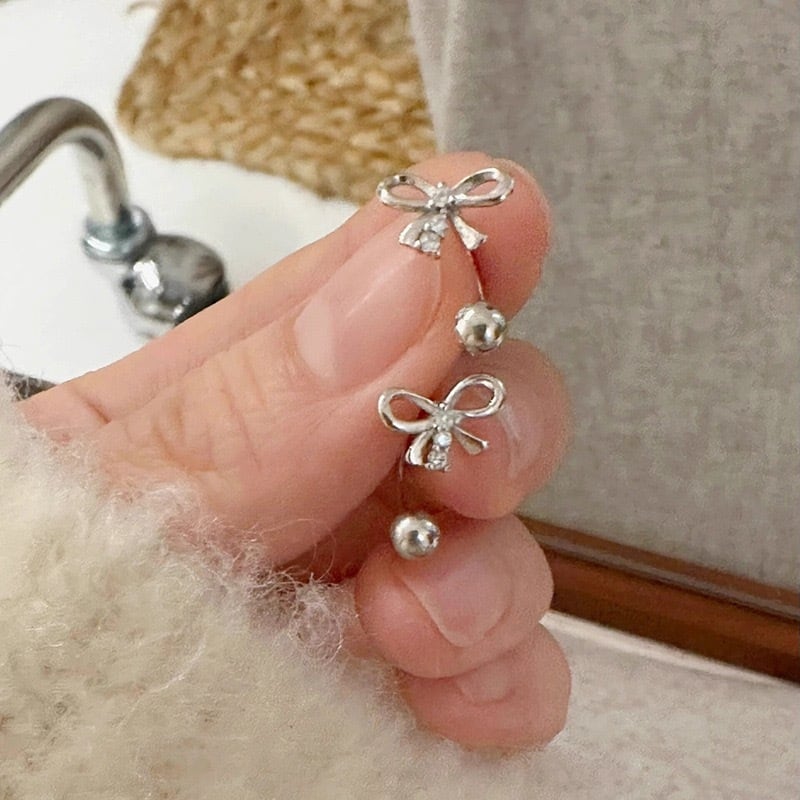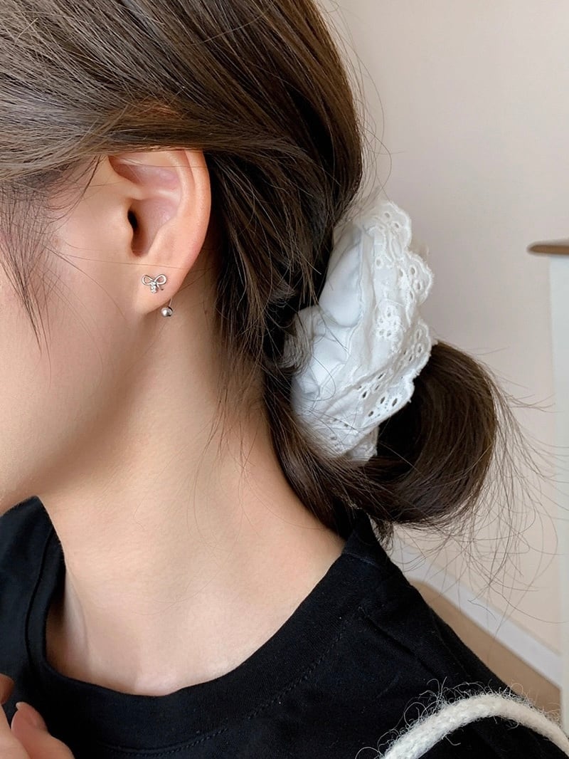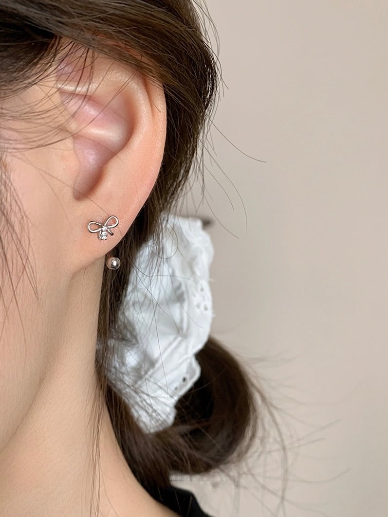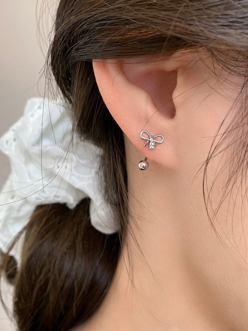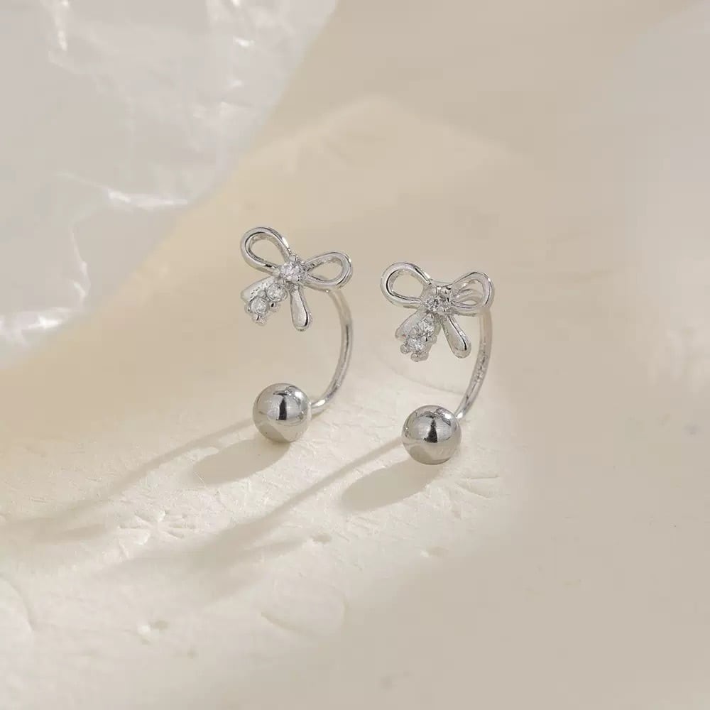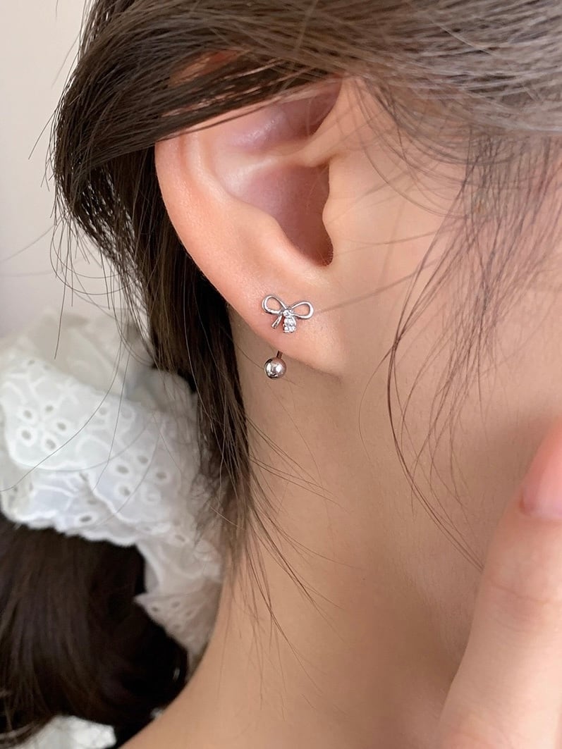 リボンモチーフとシルバーボールのイヤージャケットデザインのピアス。