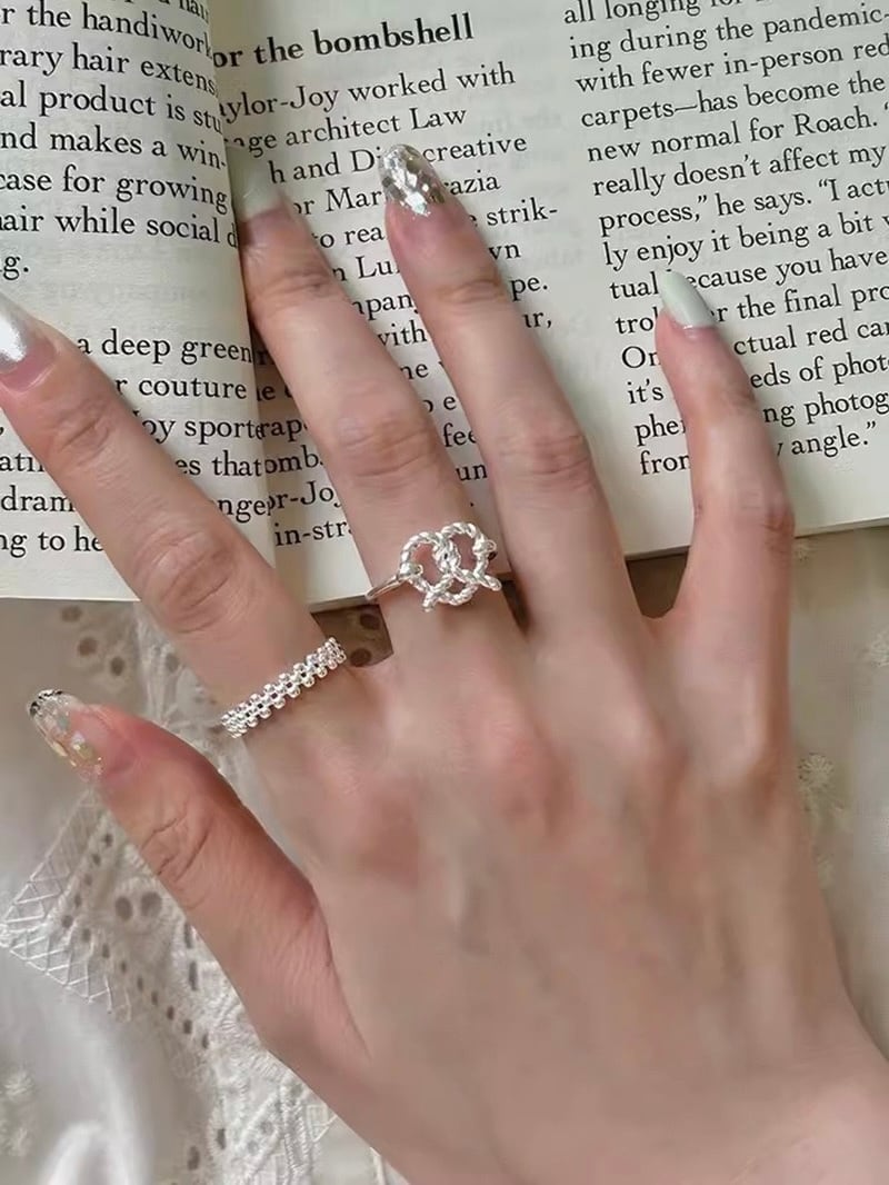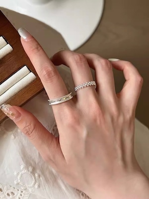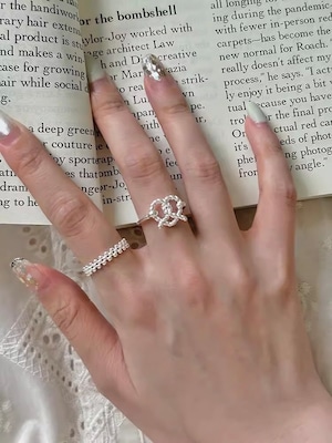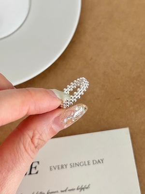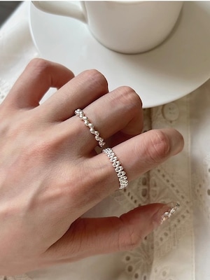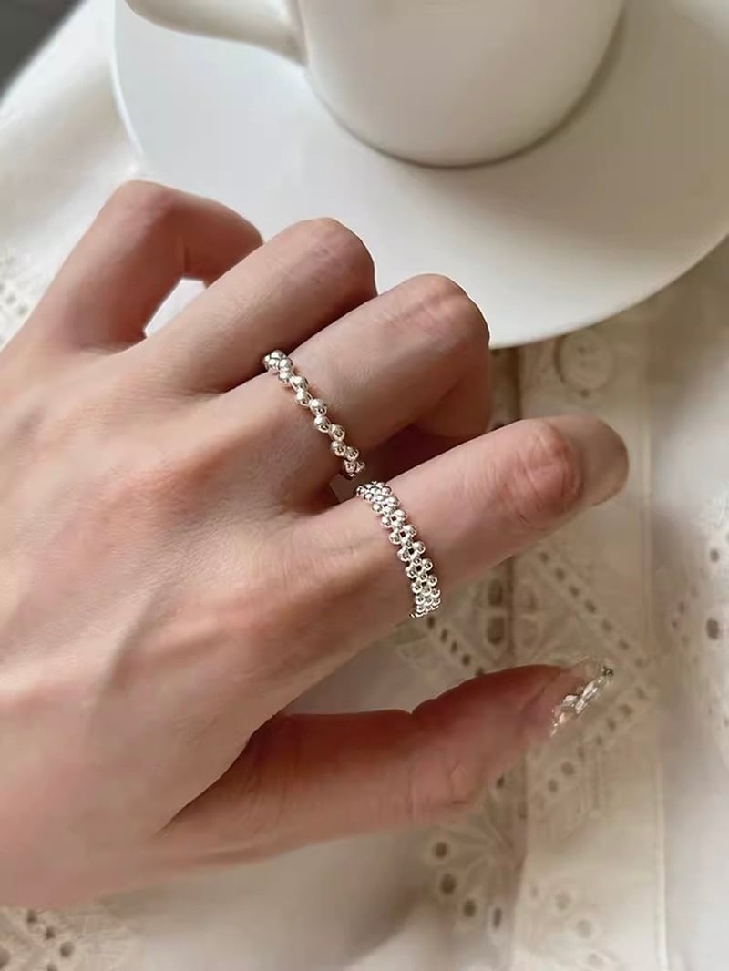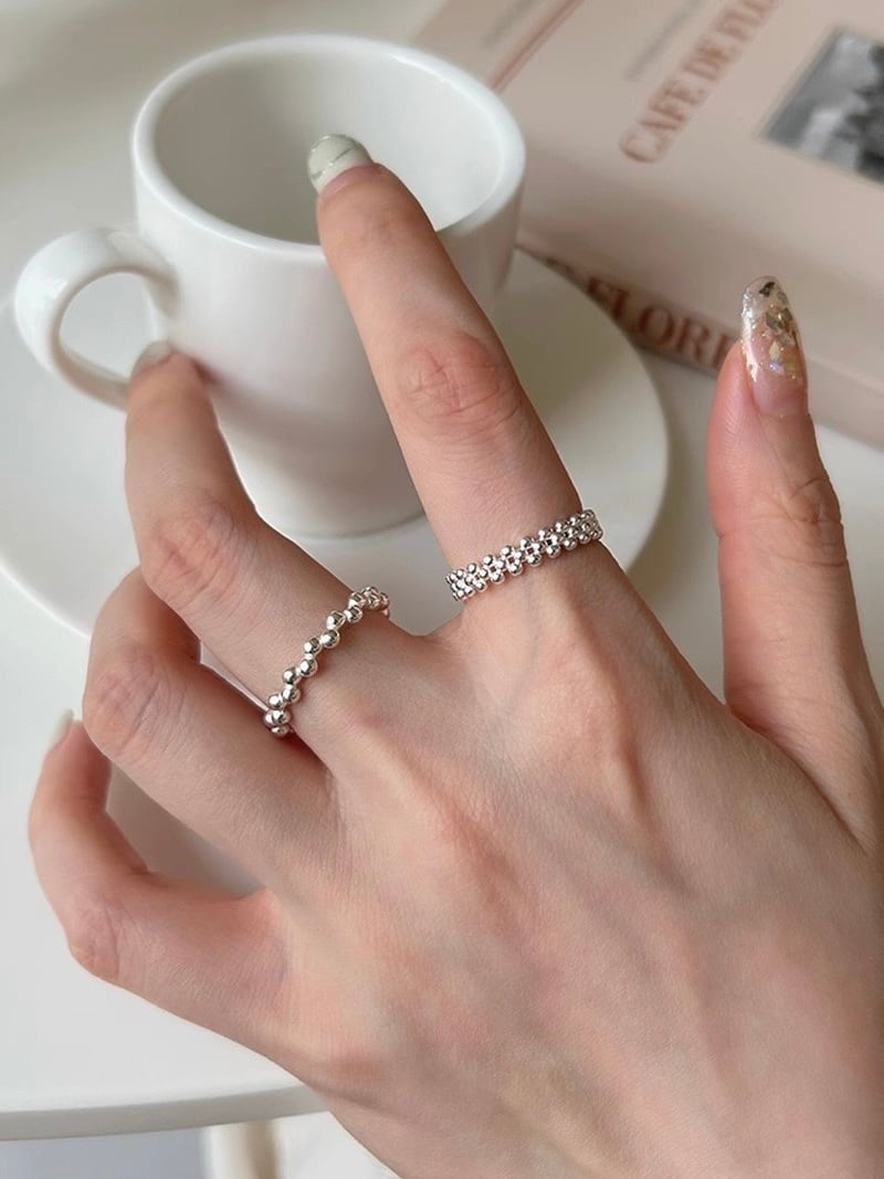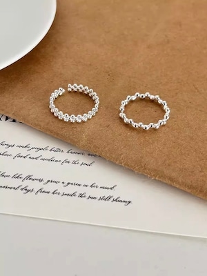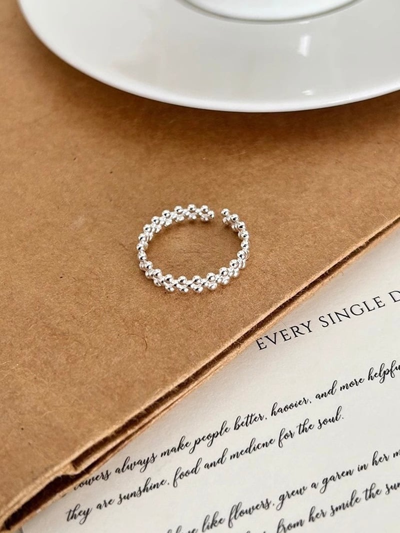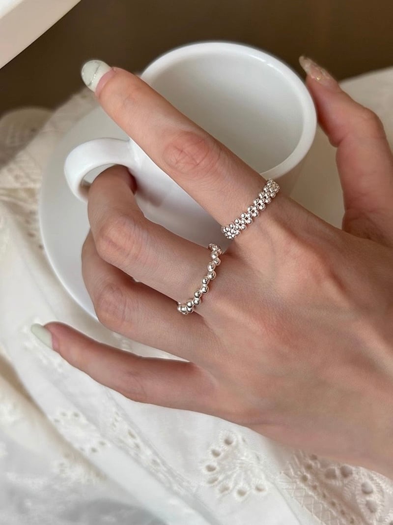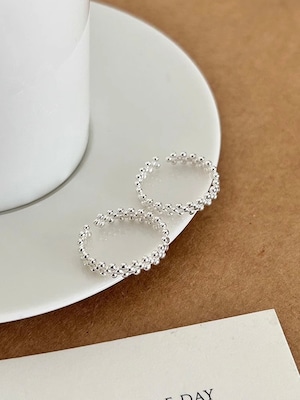 小さなシルバーボールが連なったシンプルながらもひとクセのあるリング。