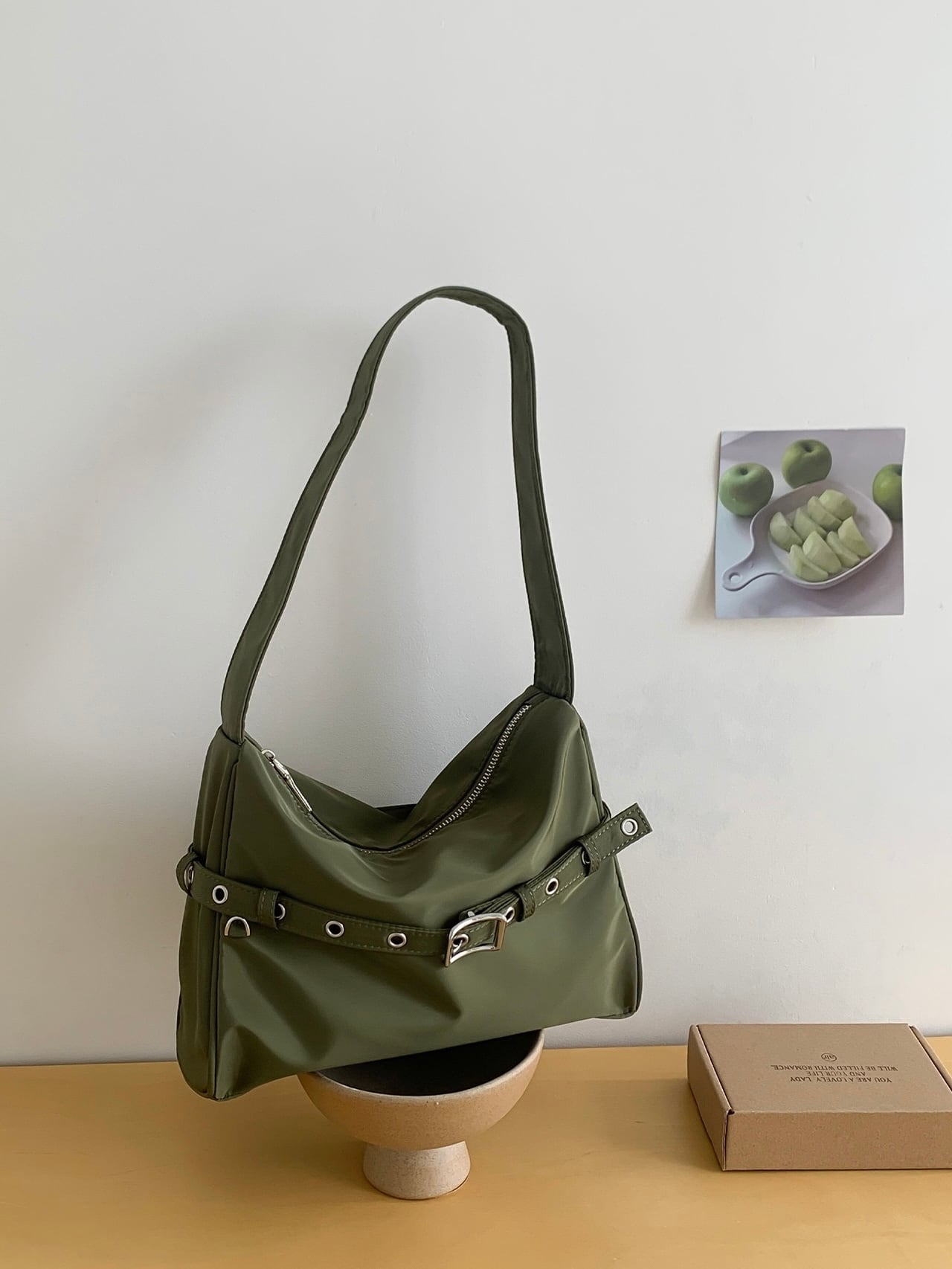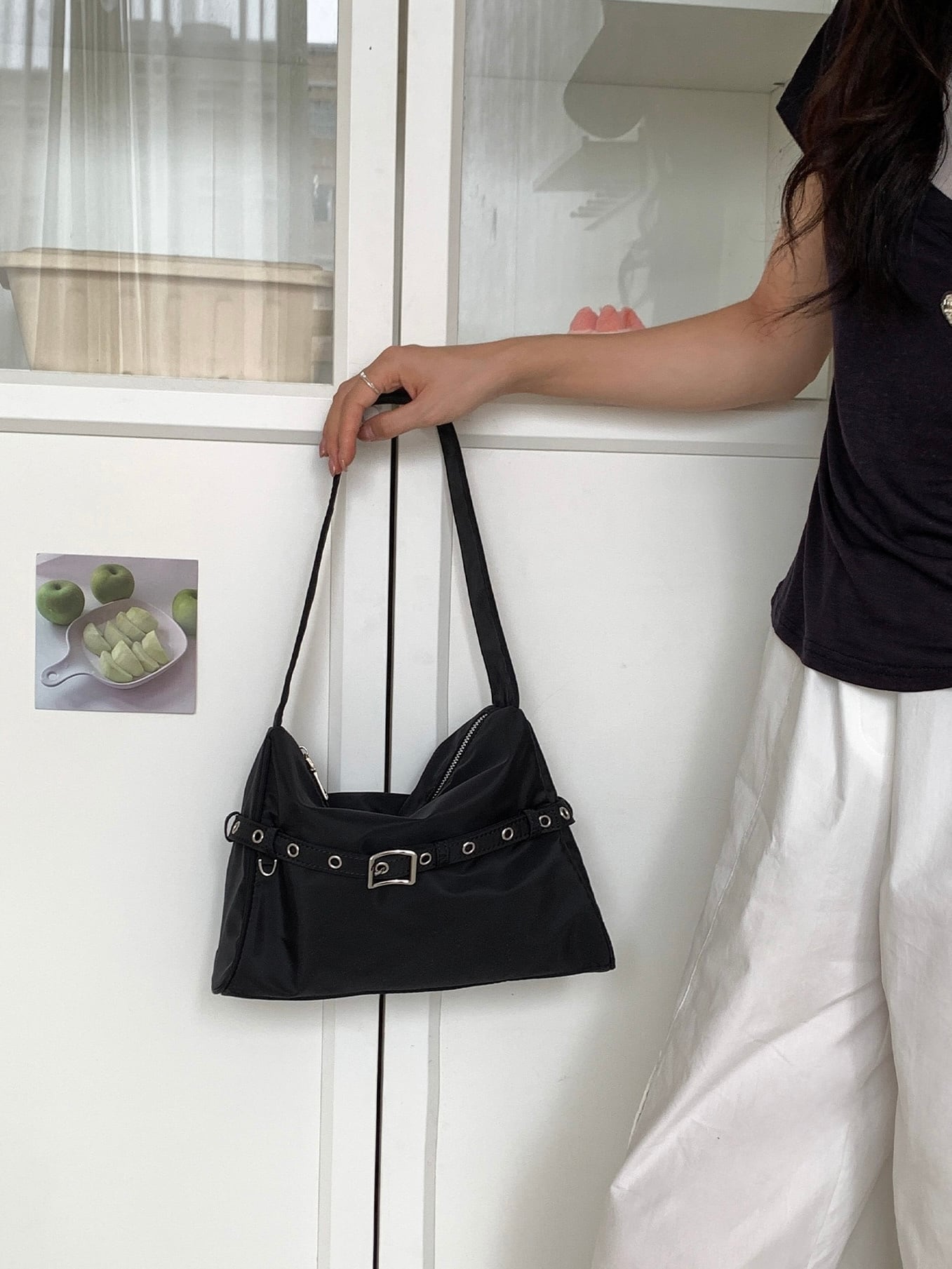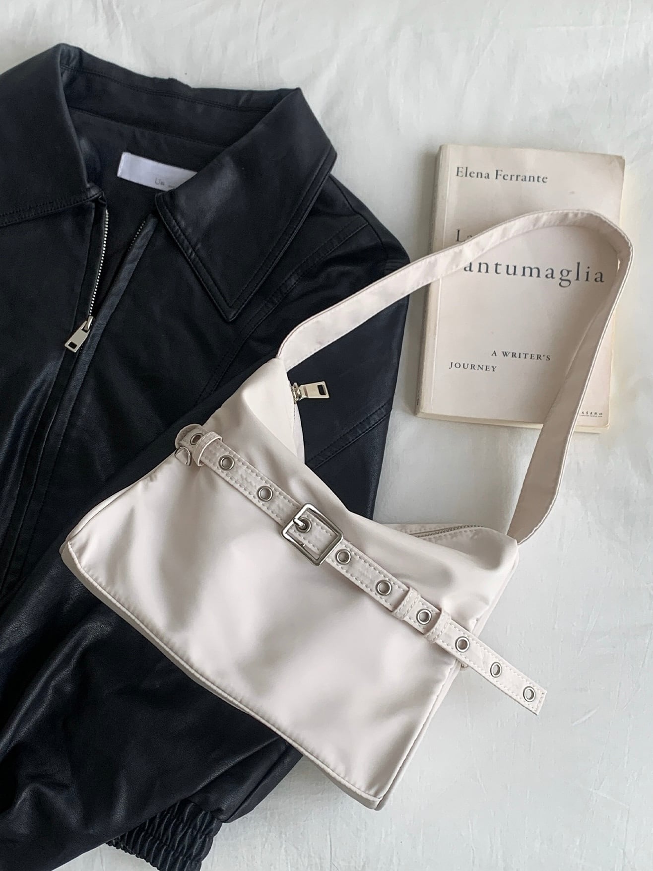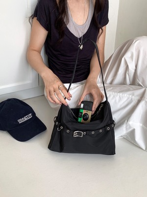 ベルトがアクセントになったスクエアバッグ。