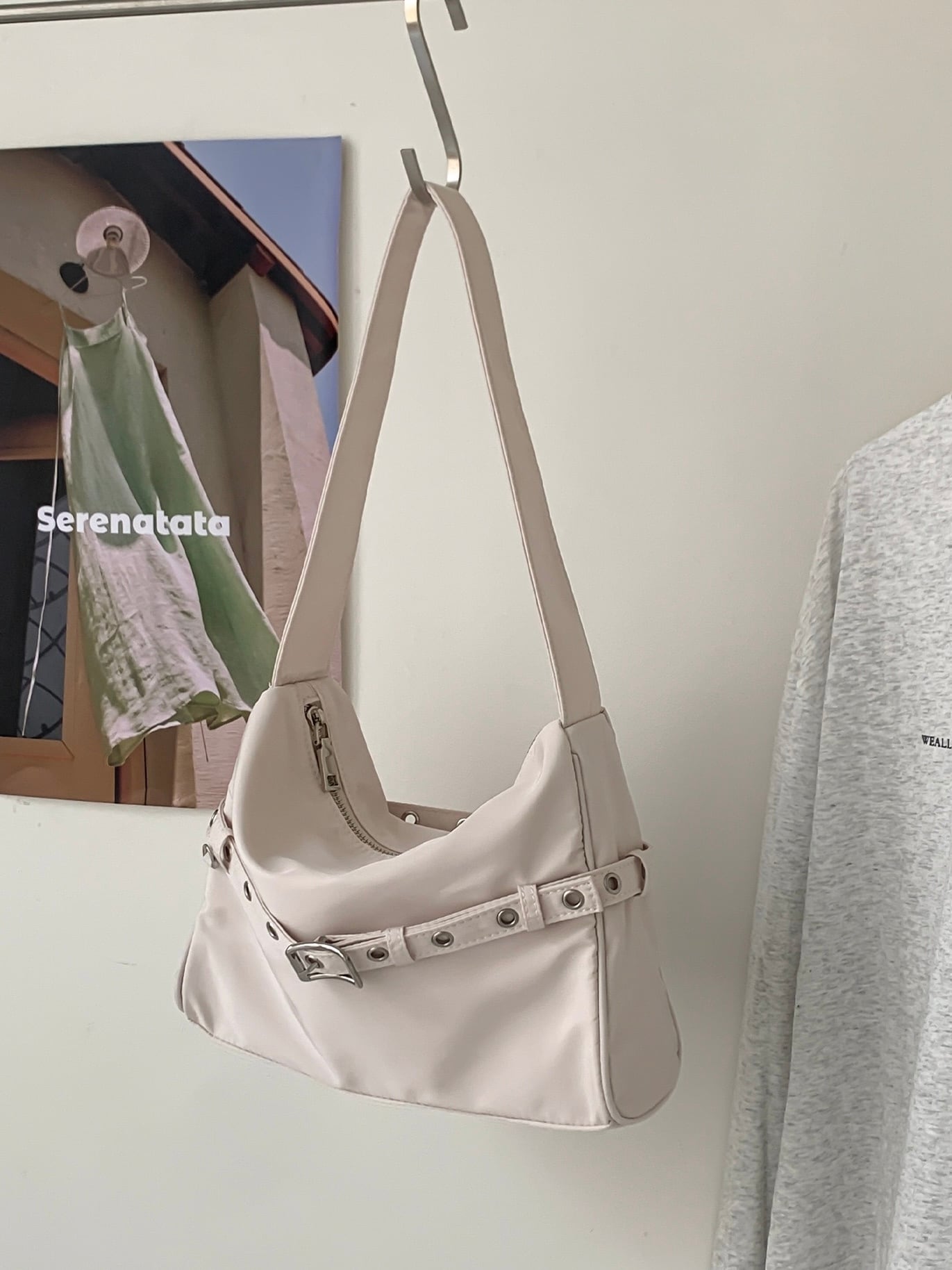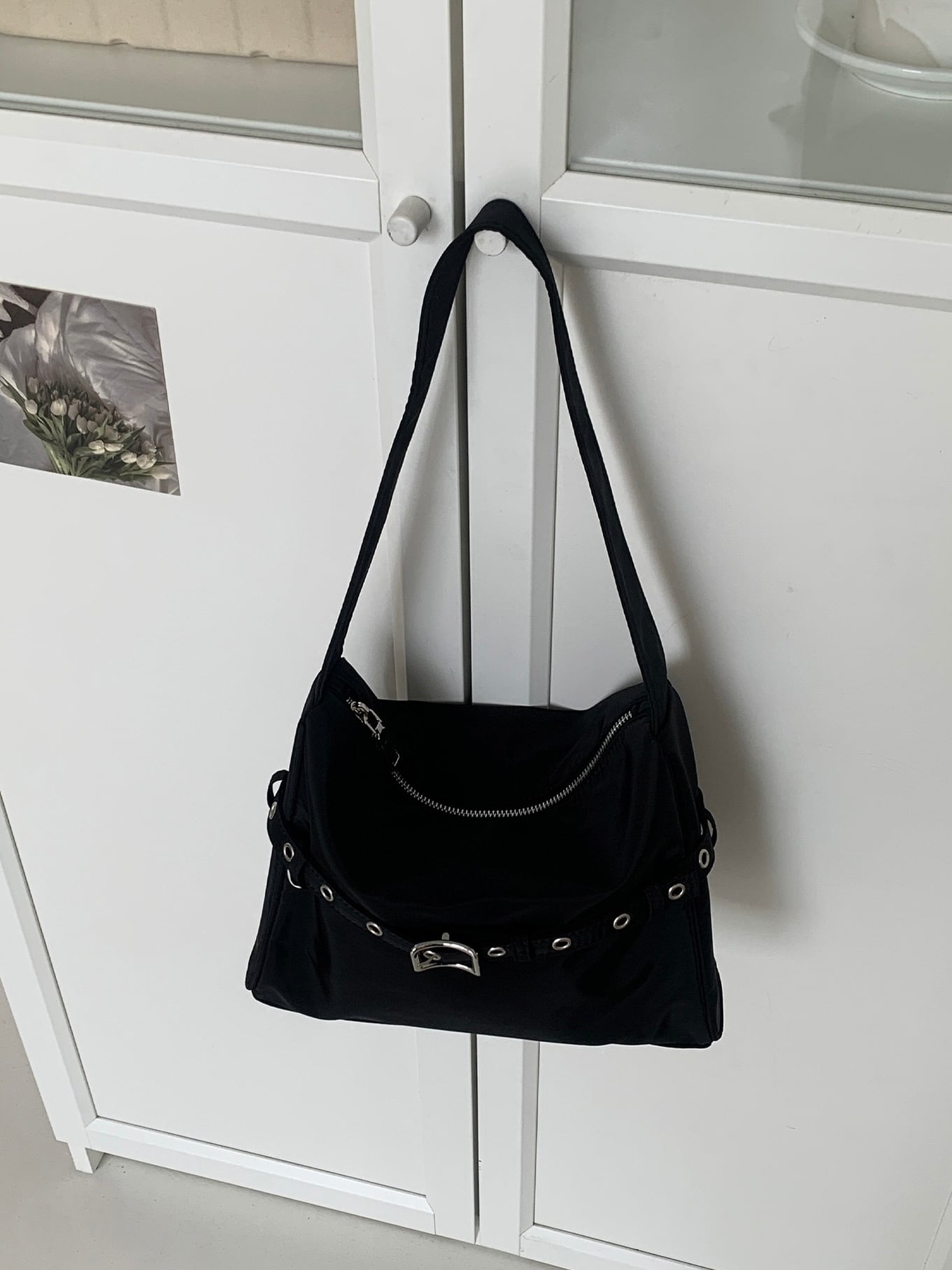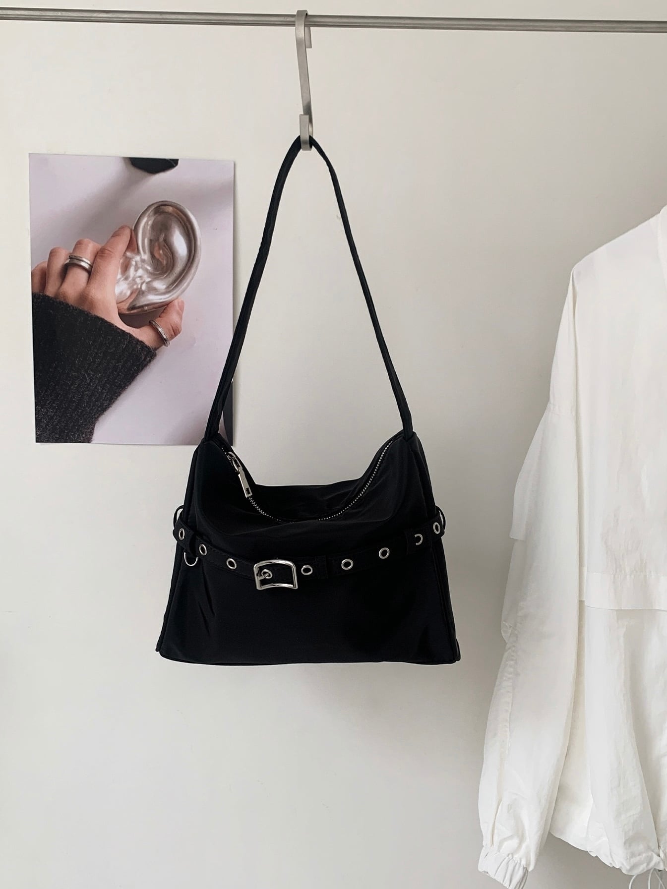 ベルトがアクセントになったスクエアバッグ。