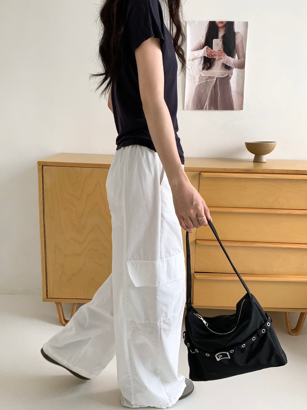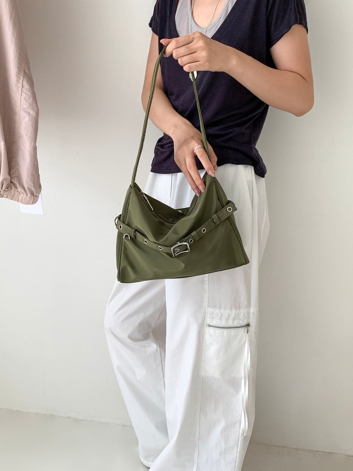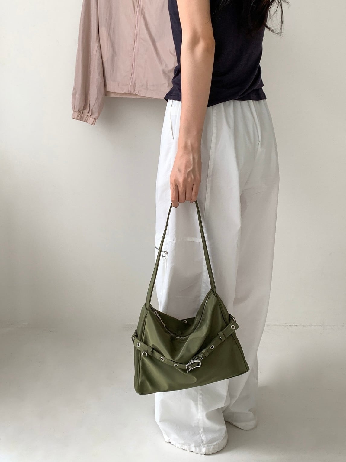 程よくハリ感のあるナイロン素材がカジュアルになりすぎず洗練された印象にしてくれます。