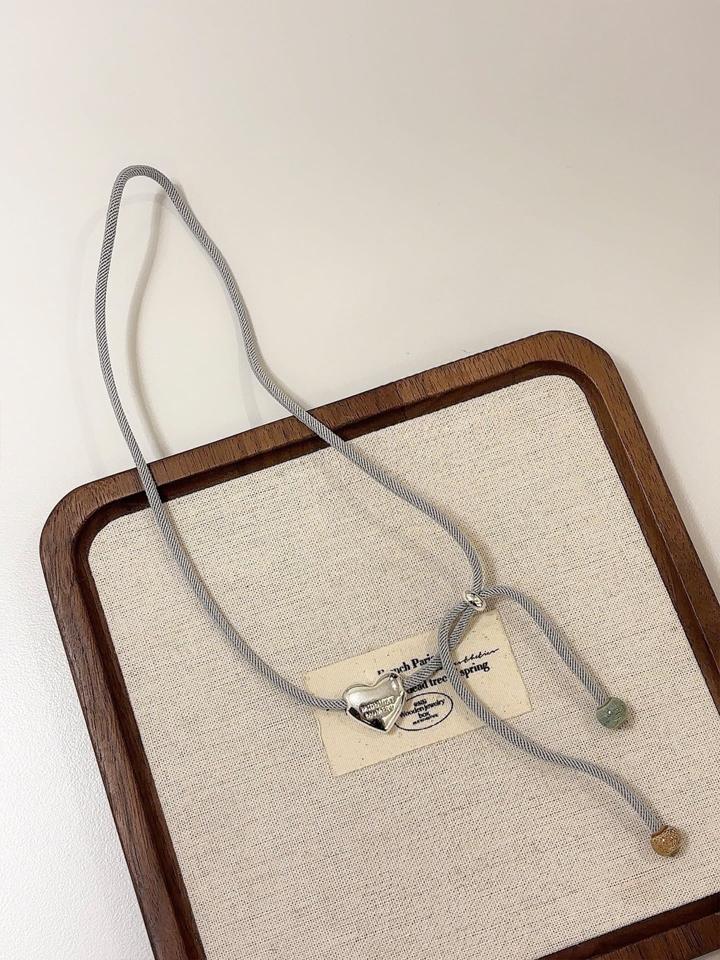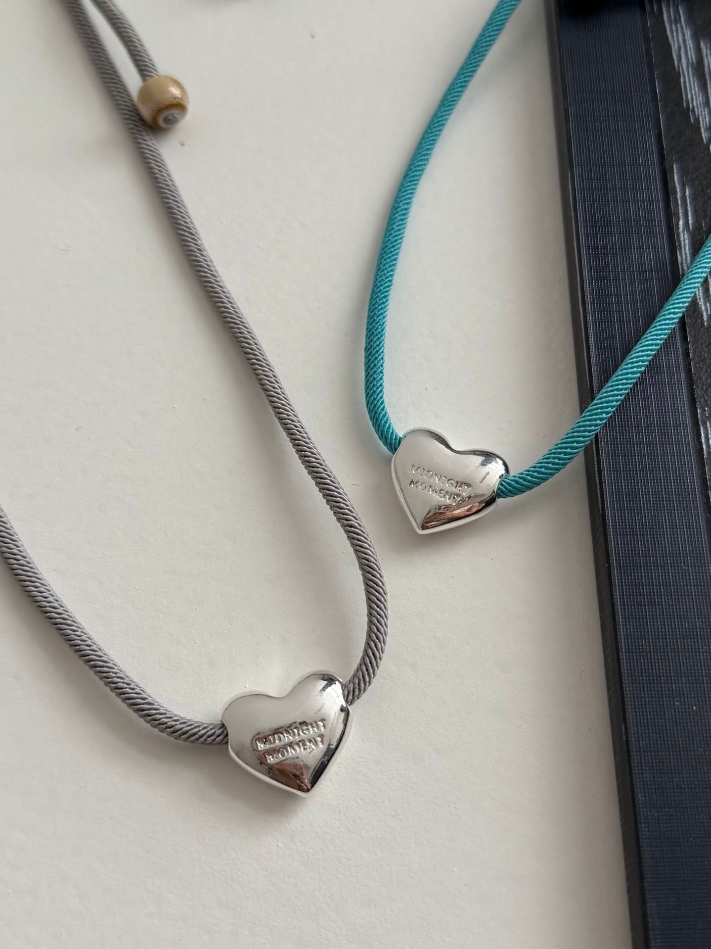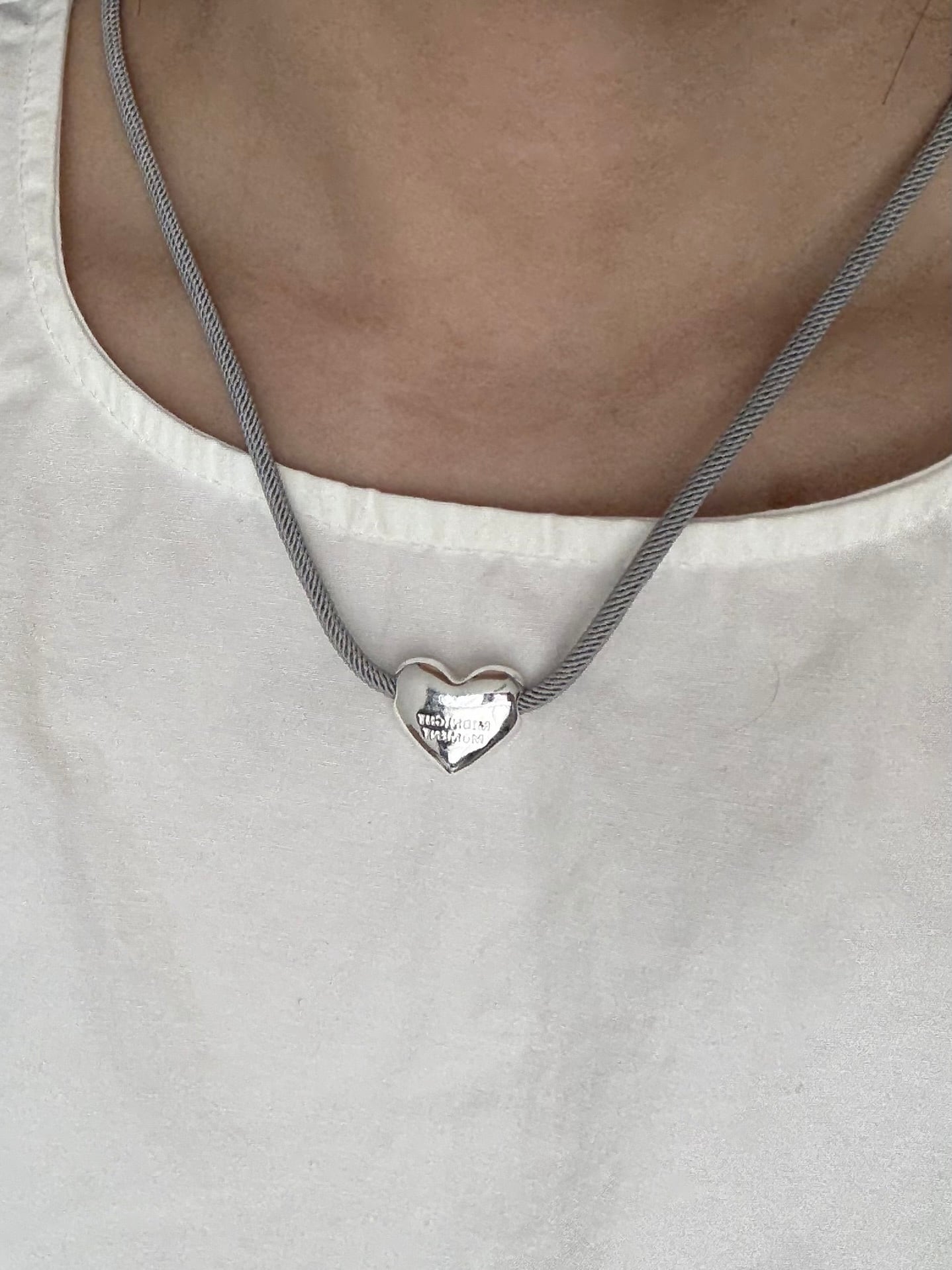 シルバーカラーのハートペンダントに太めの紐がカジュアルで使いやすいコードネックレス。