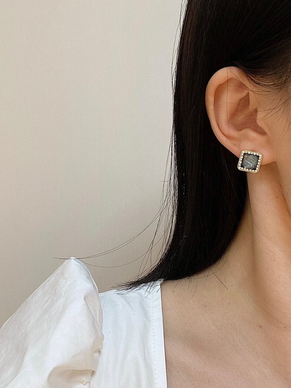 真ん中の暗めなシルバーカラーのストーンが大人っぽいイヤリングです。