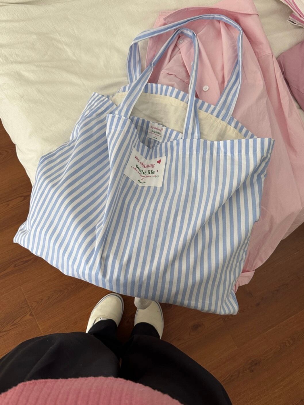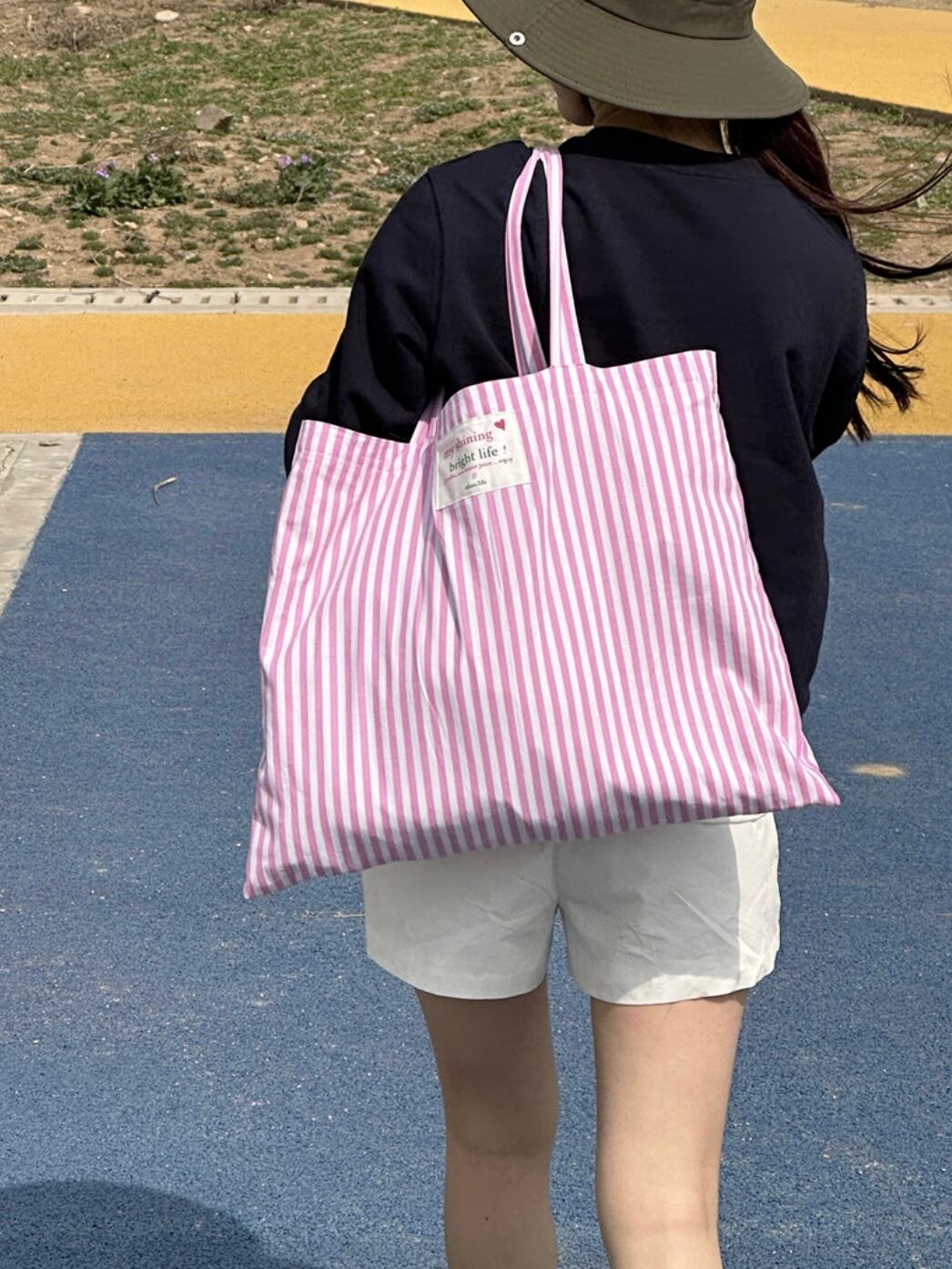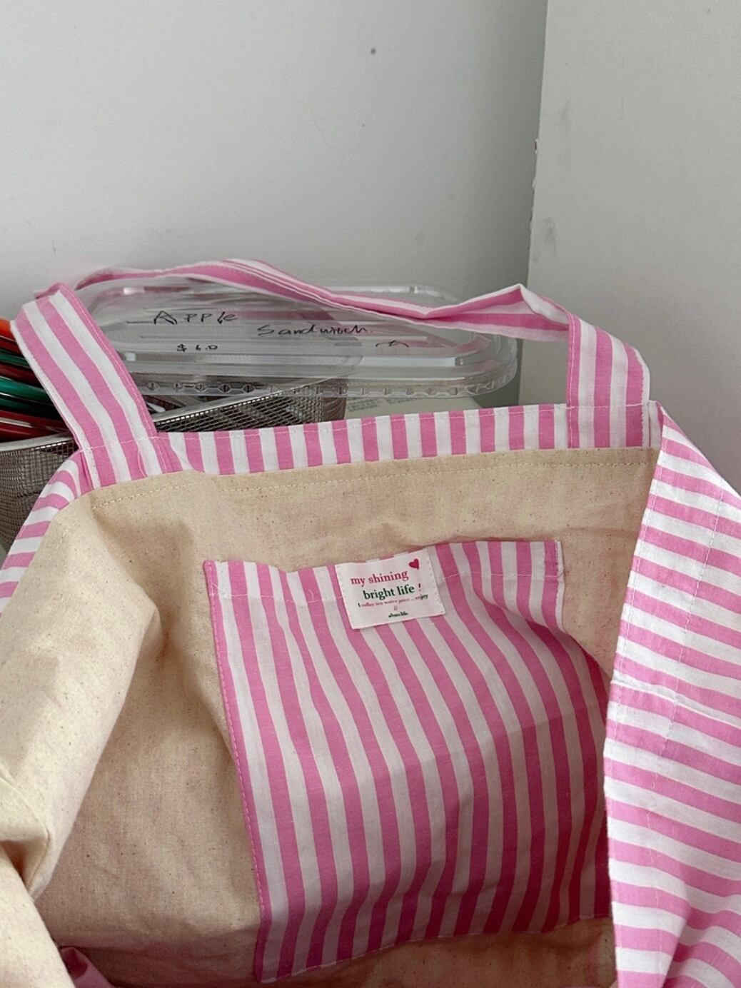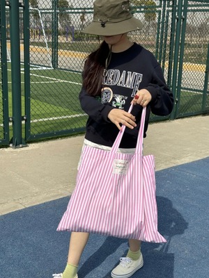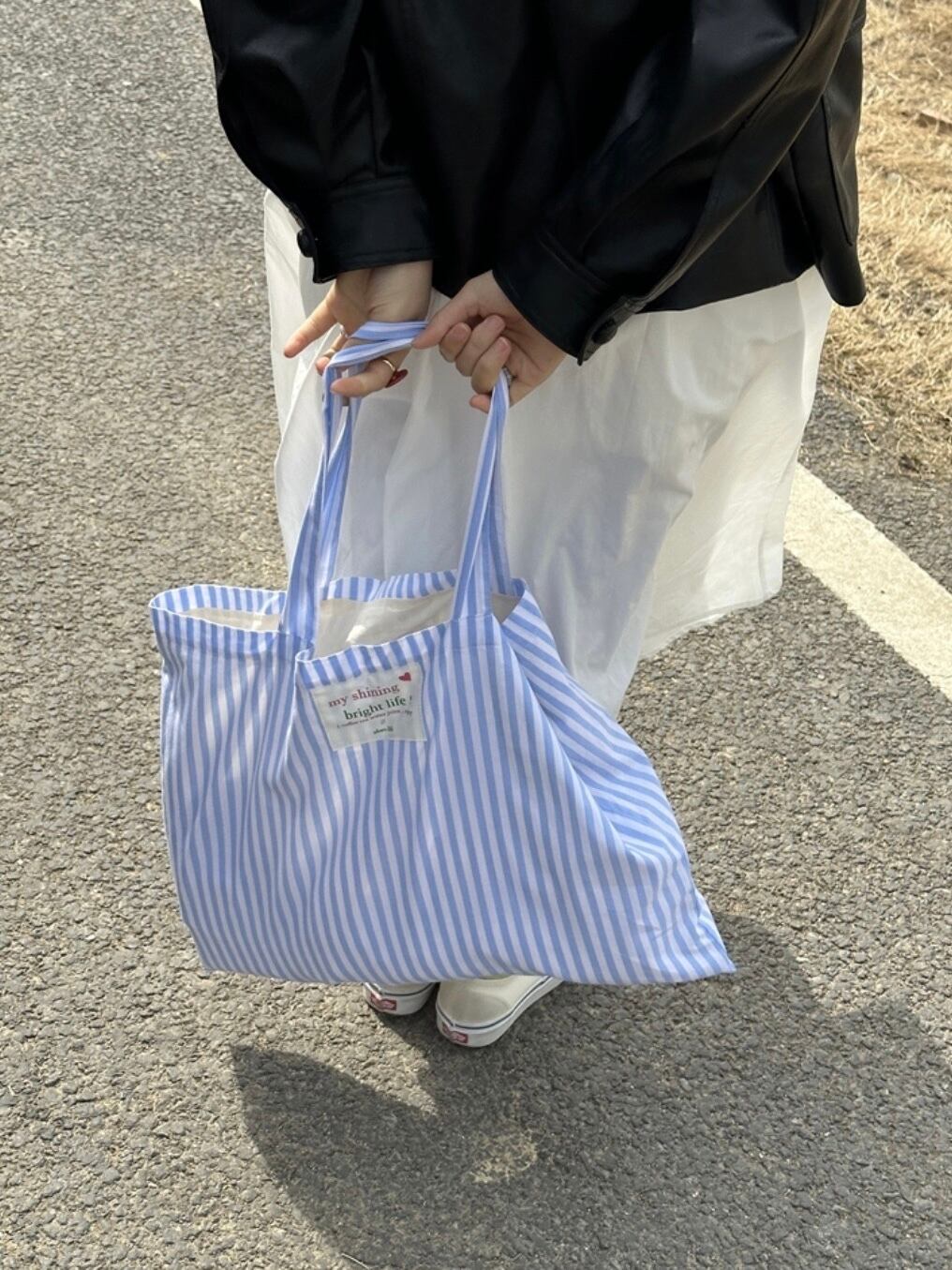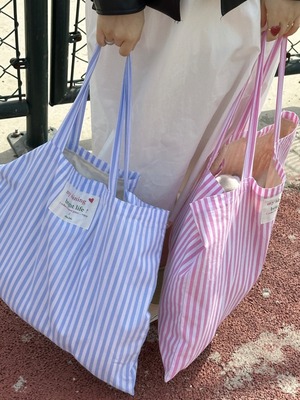 細めのストライプとロゴの入ったタグが可愛らしいトートバッグです。