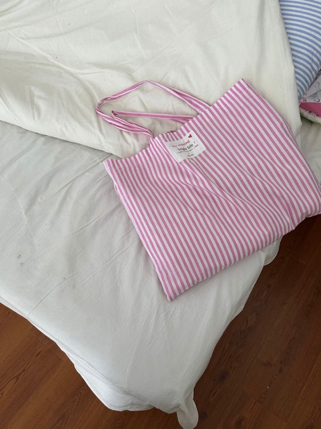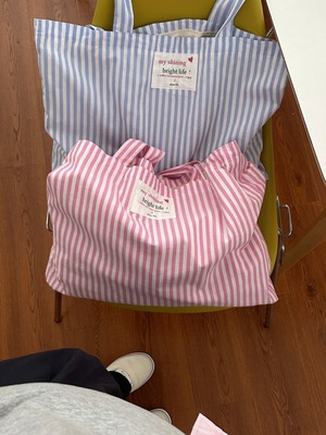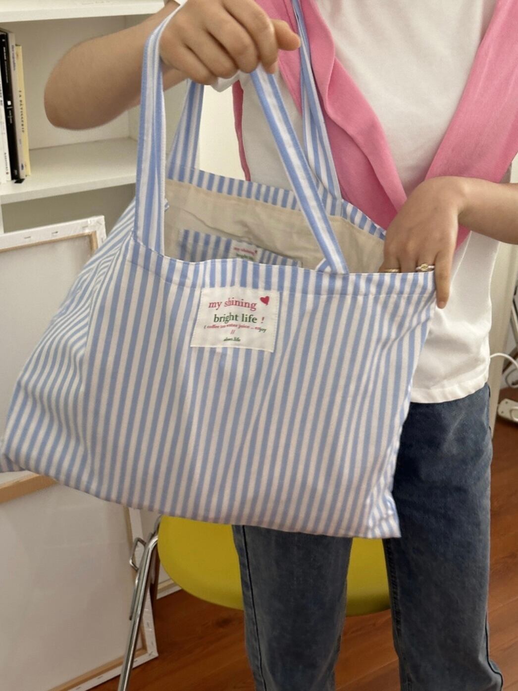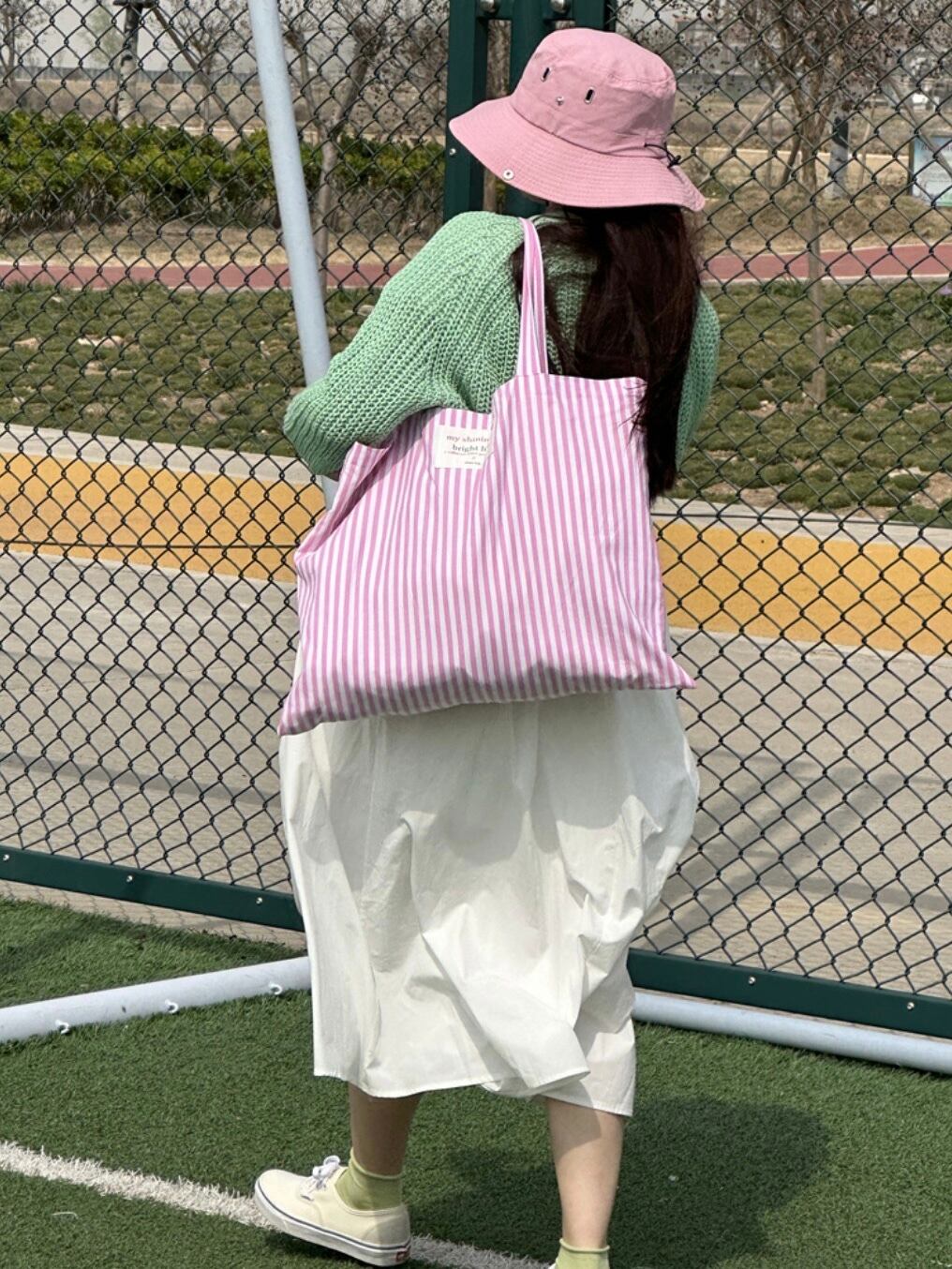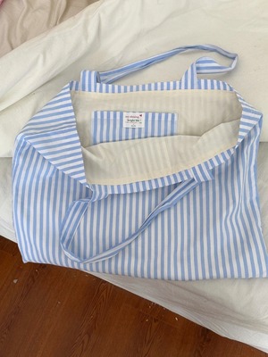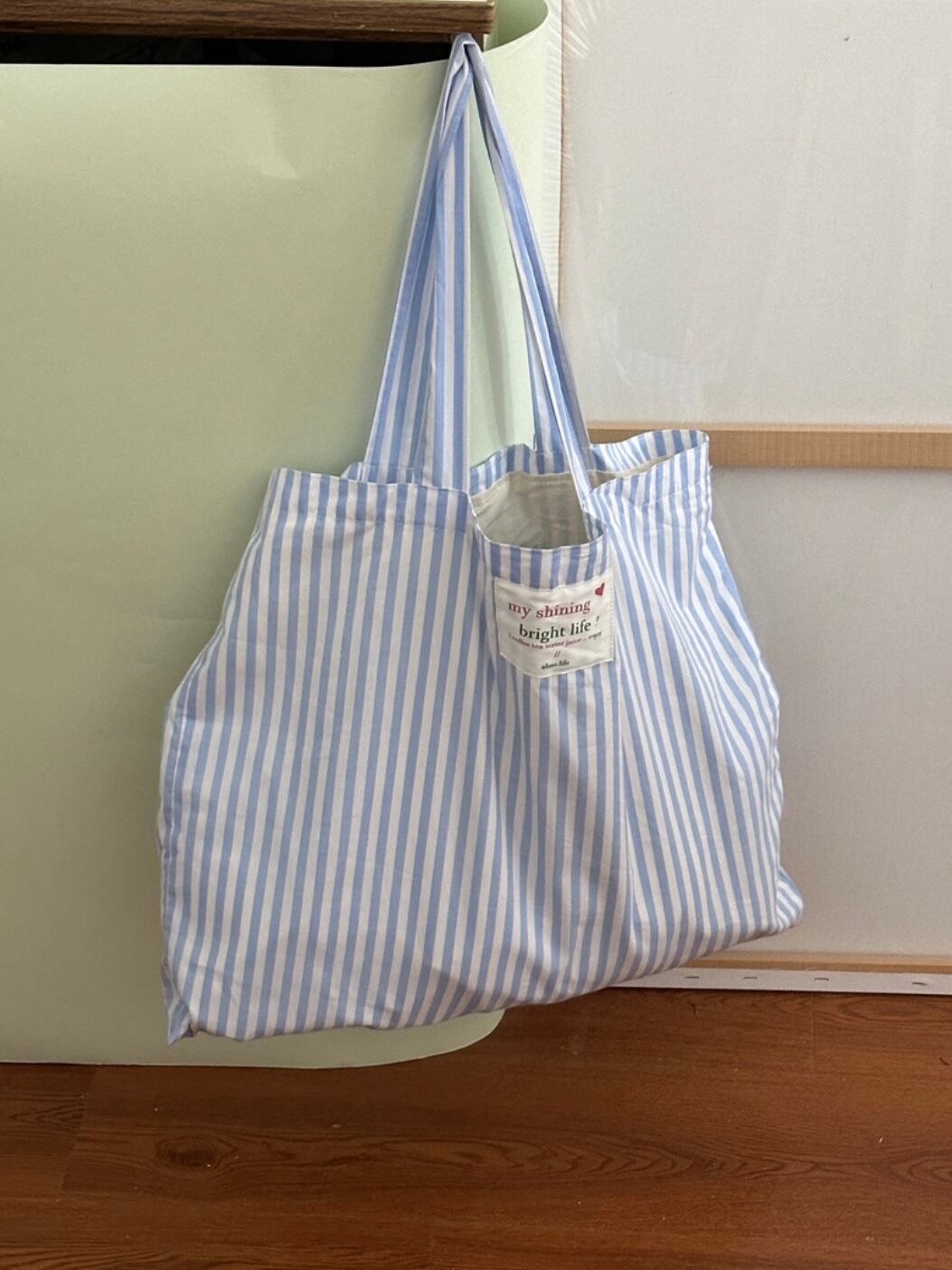 細めのストライプとロゴの入ったタグが可愛らしいトートバッグです。