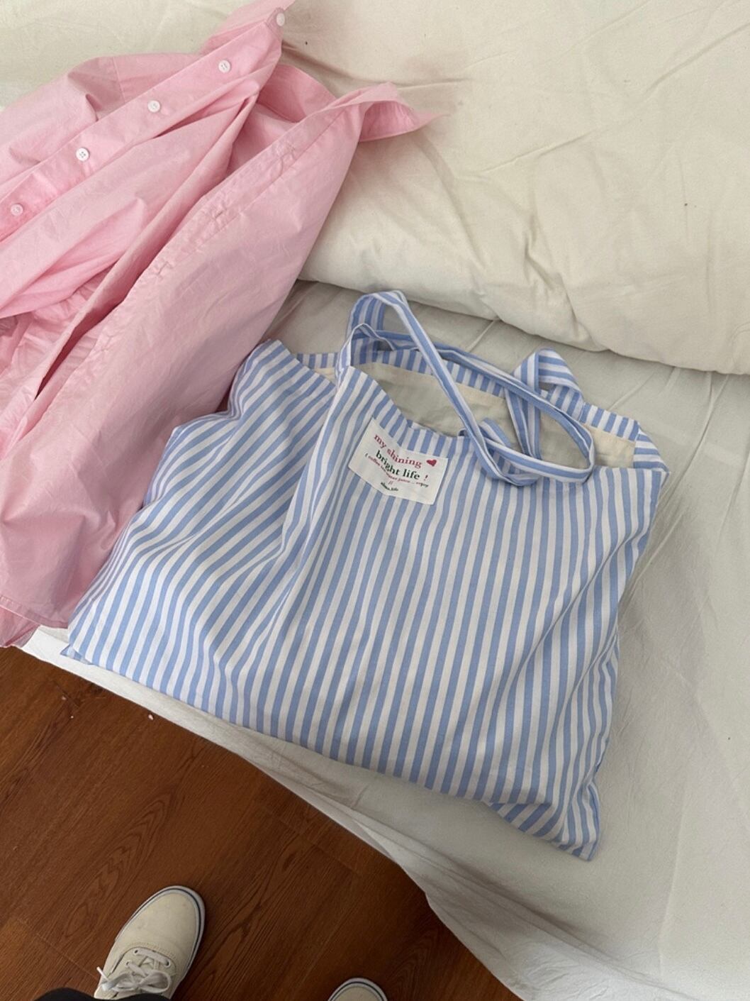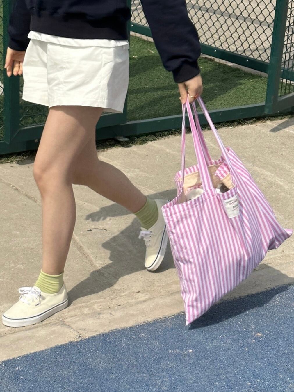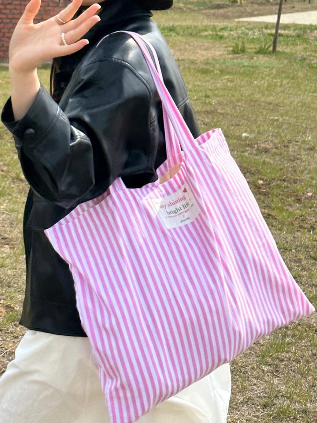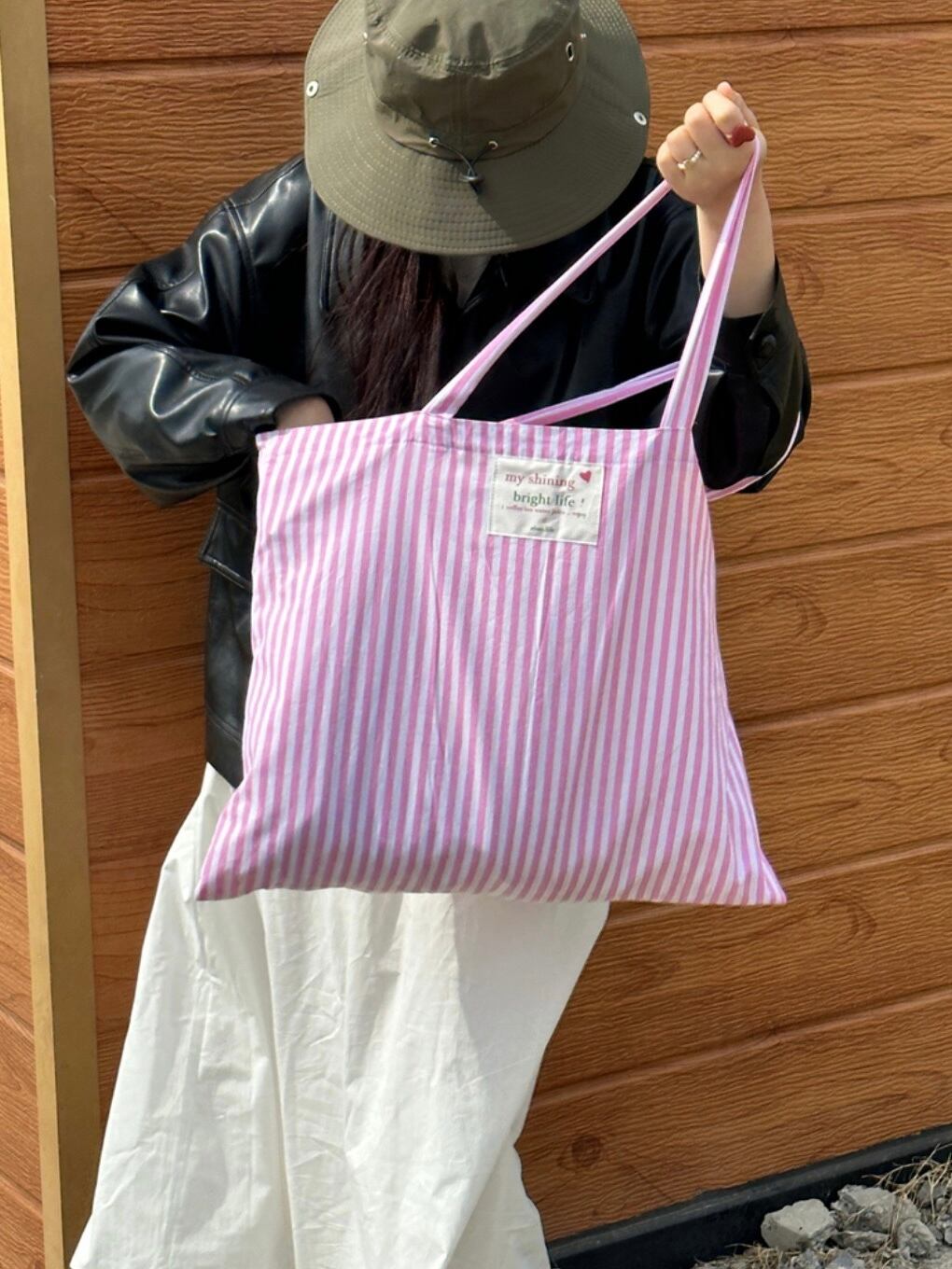 細めのストライプとロゴの入ったタグが可愛らしいトートバッグです。
