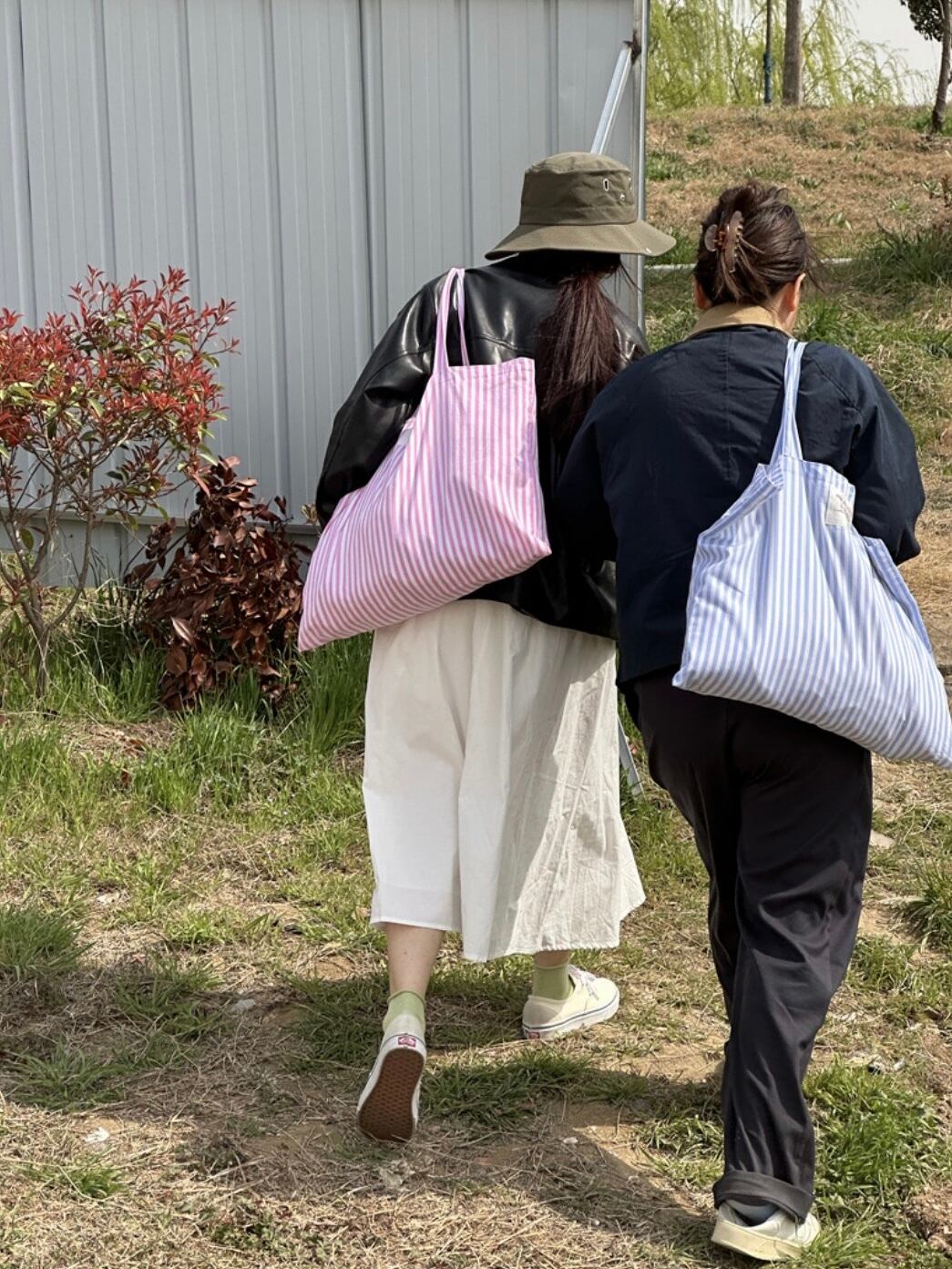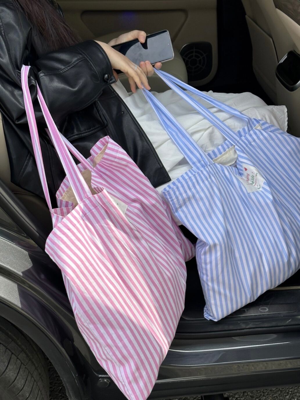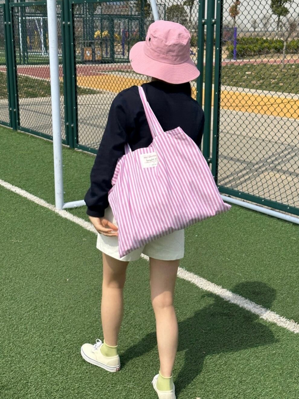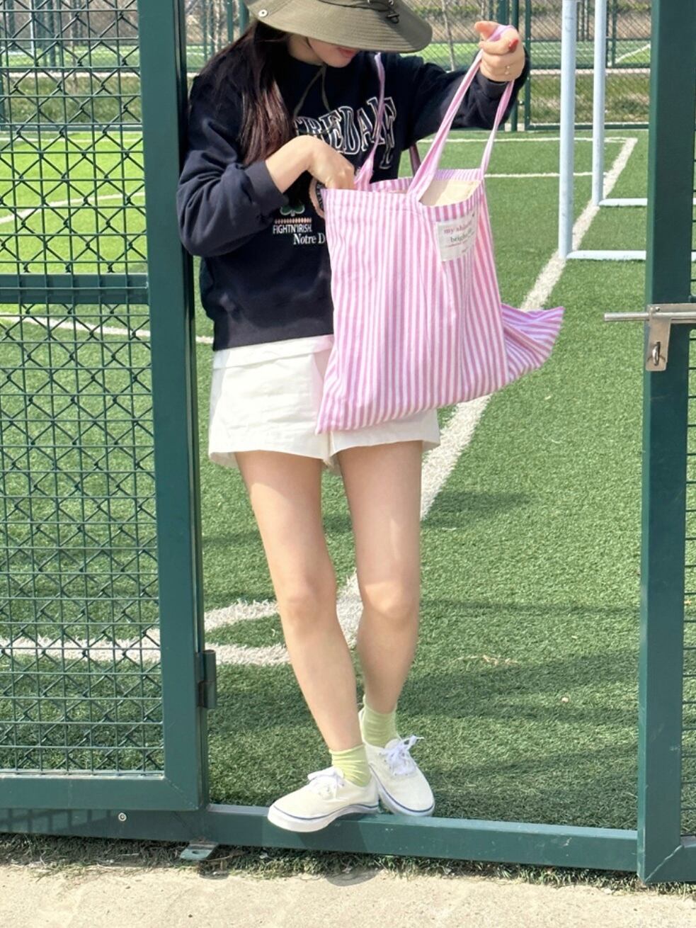 細めのストライプとロゴの入ったタグが可愛らしいトートバッグです。