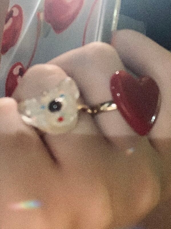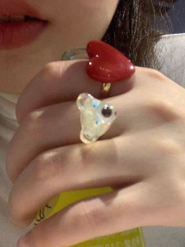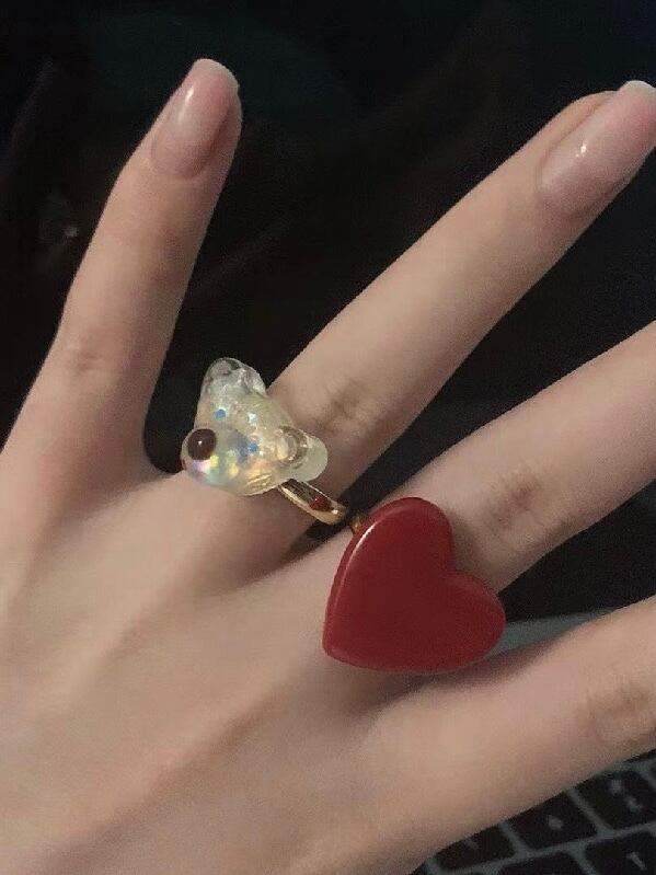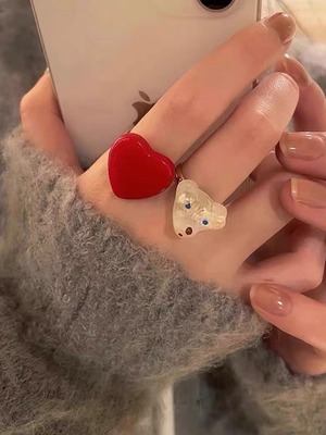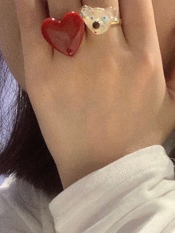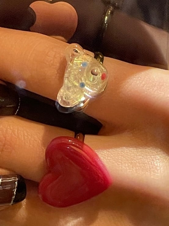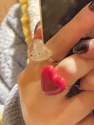 キャンディのような素材のクマリングと、赤いハートがアクセントになるリングのセットです。