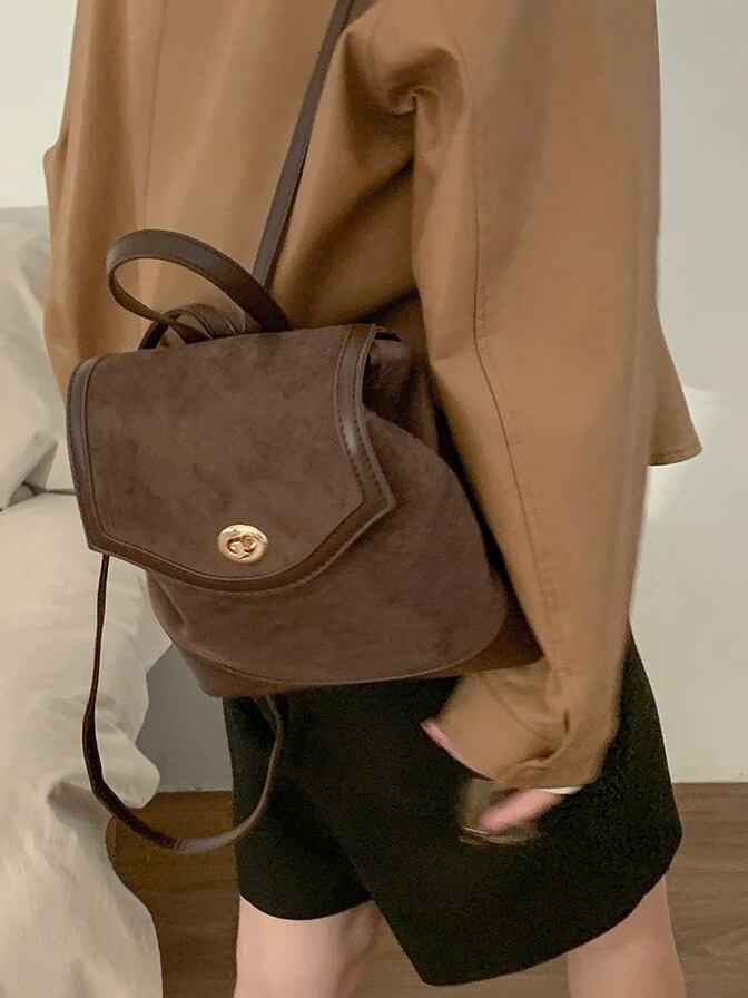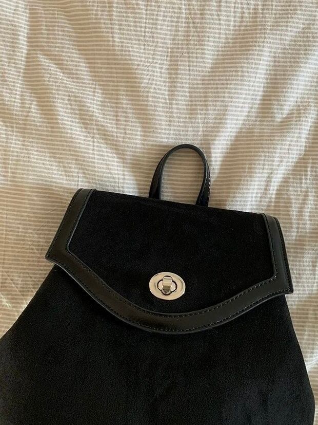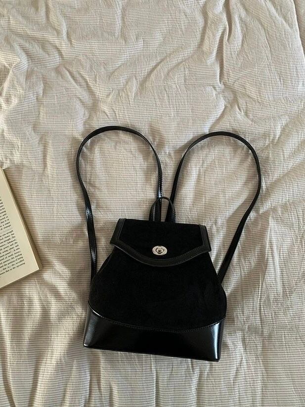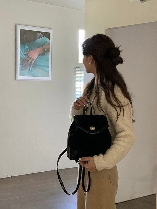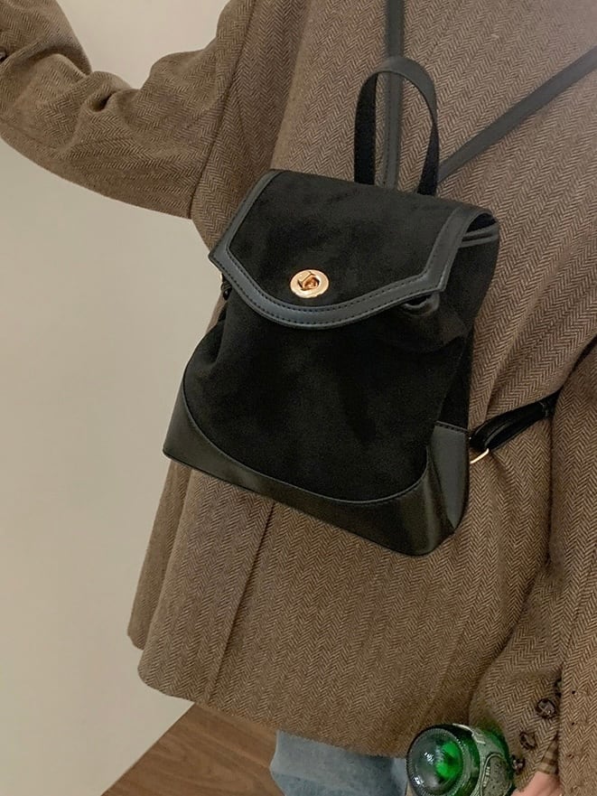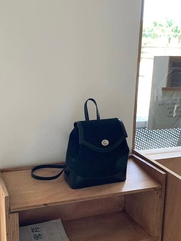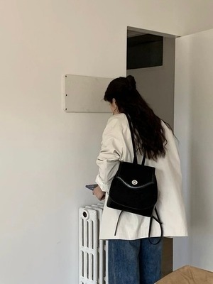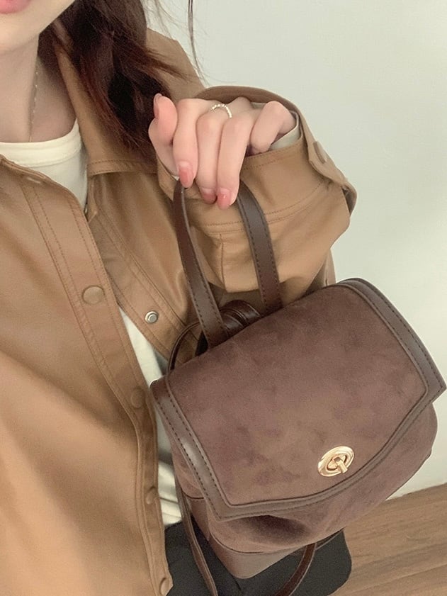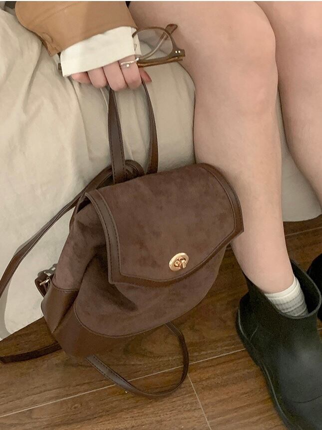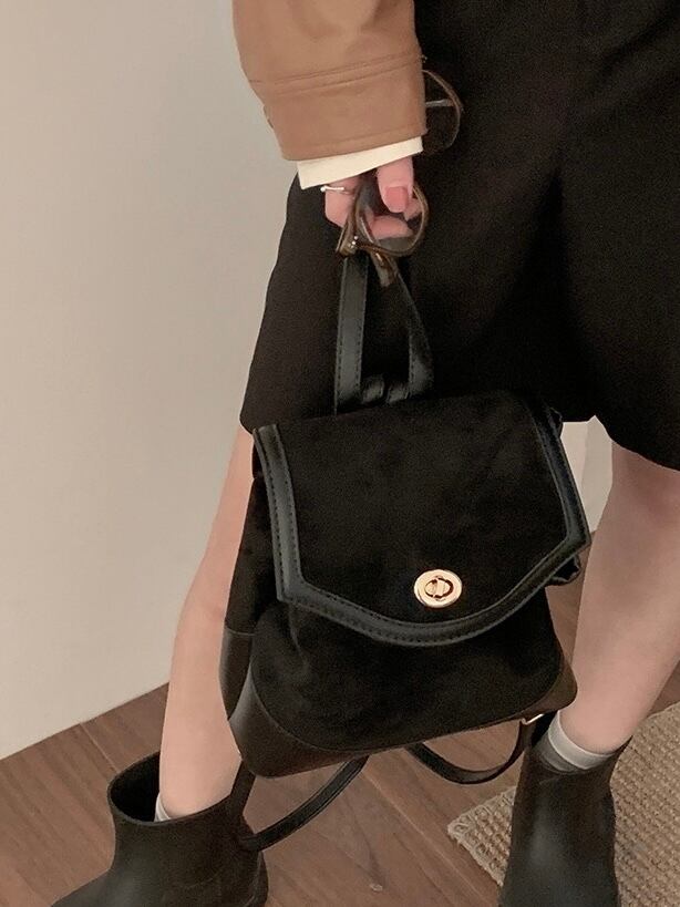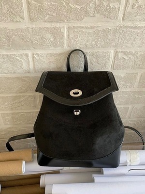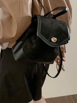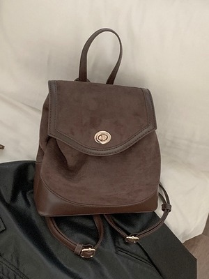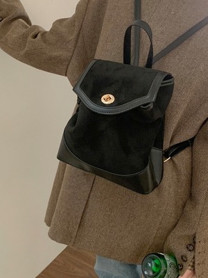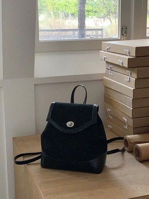 スエード素材にレザーのパイピングのデザインが魅力的なリュックです。