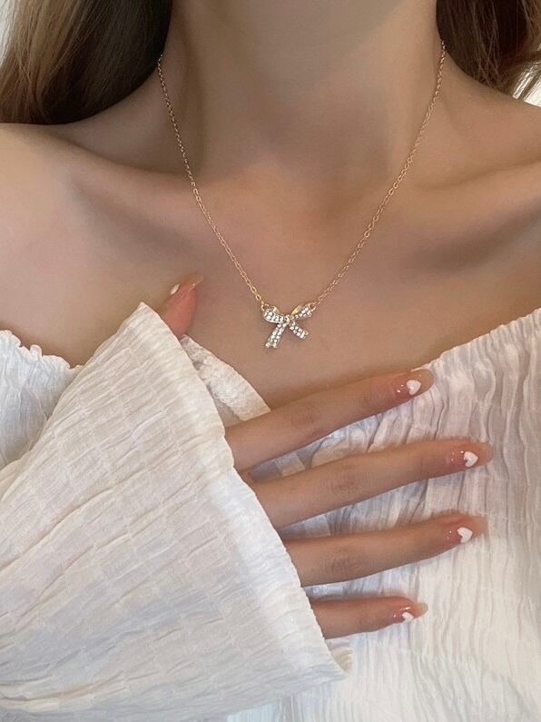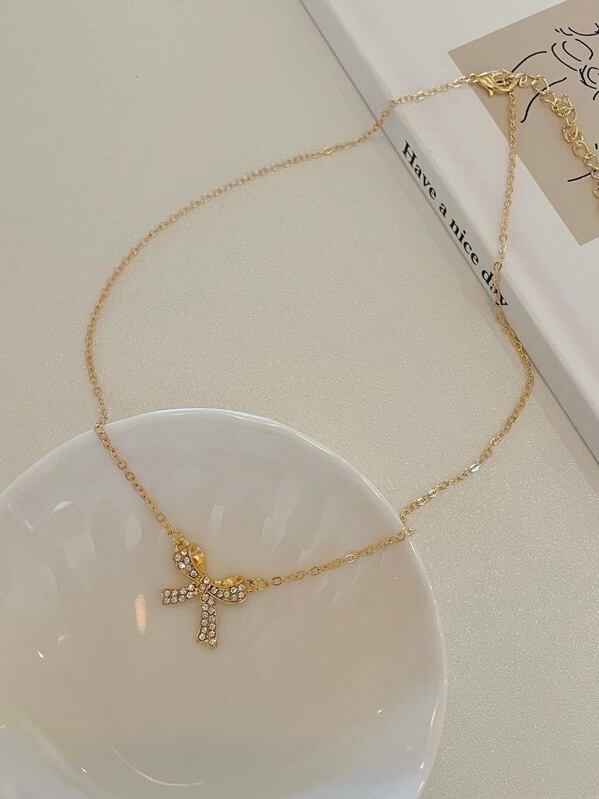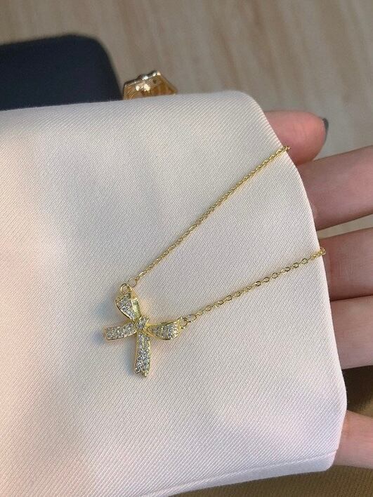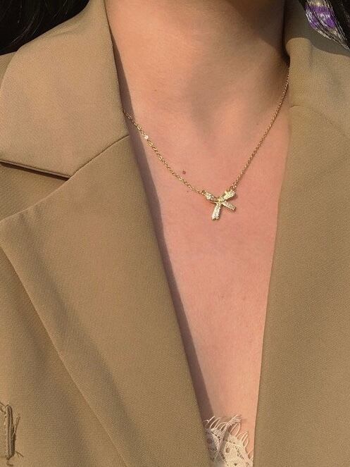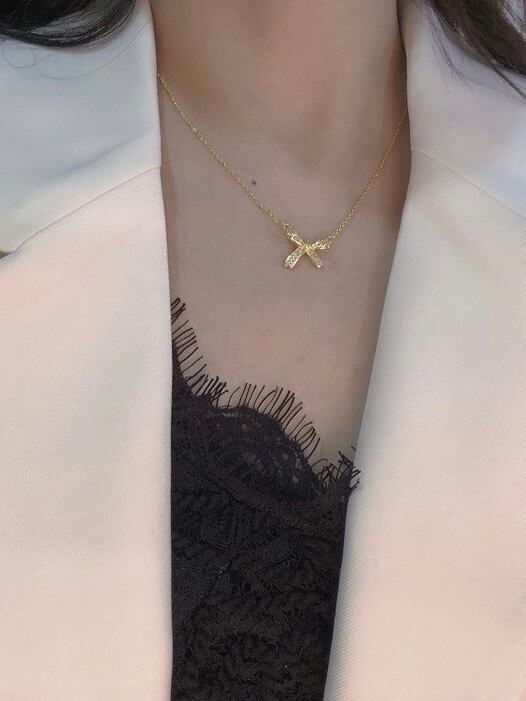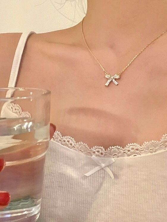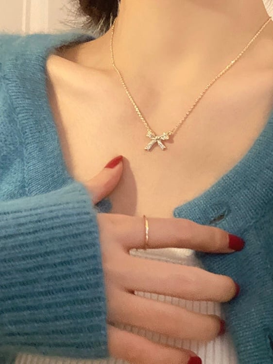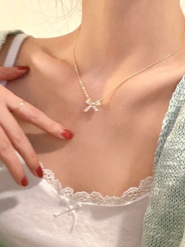 ストーンがキラキラとして華やかなリボンモチーフのネックレスです。