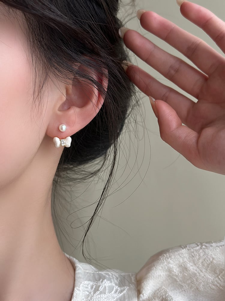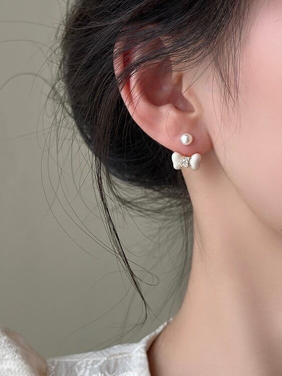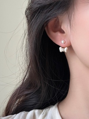 ぷっくりとしたディテールのリボンが可愛らしいピアス。