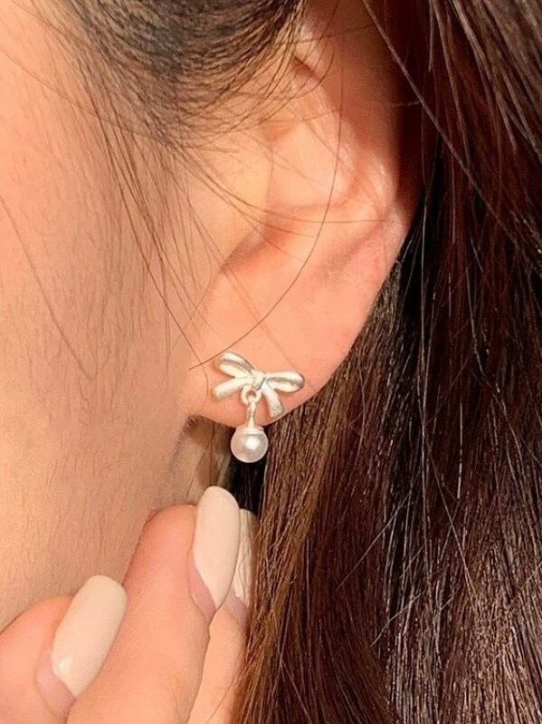 シルバーカラーのリボンとパールの組み合わせが可愛らしいピアス。