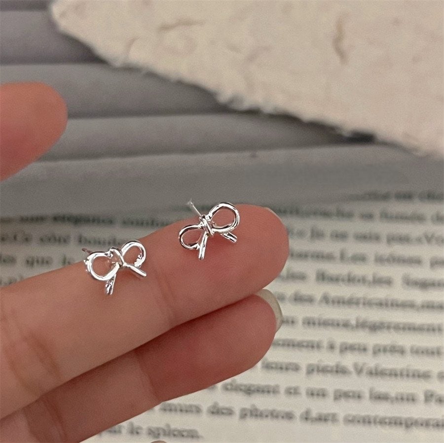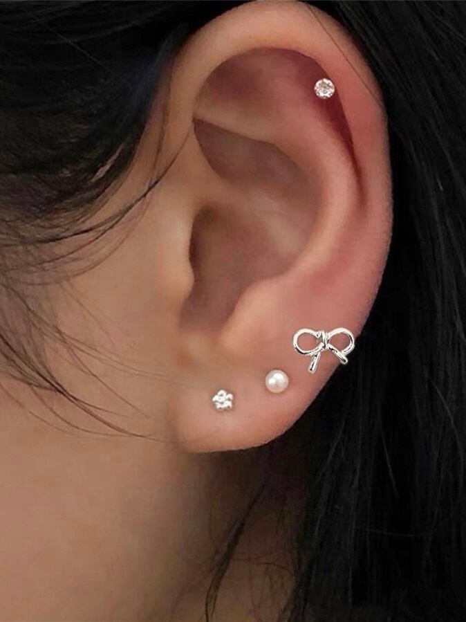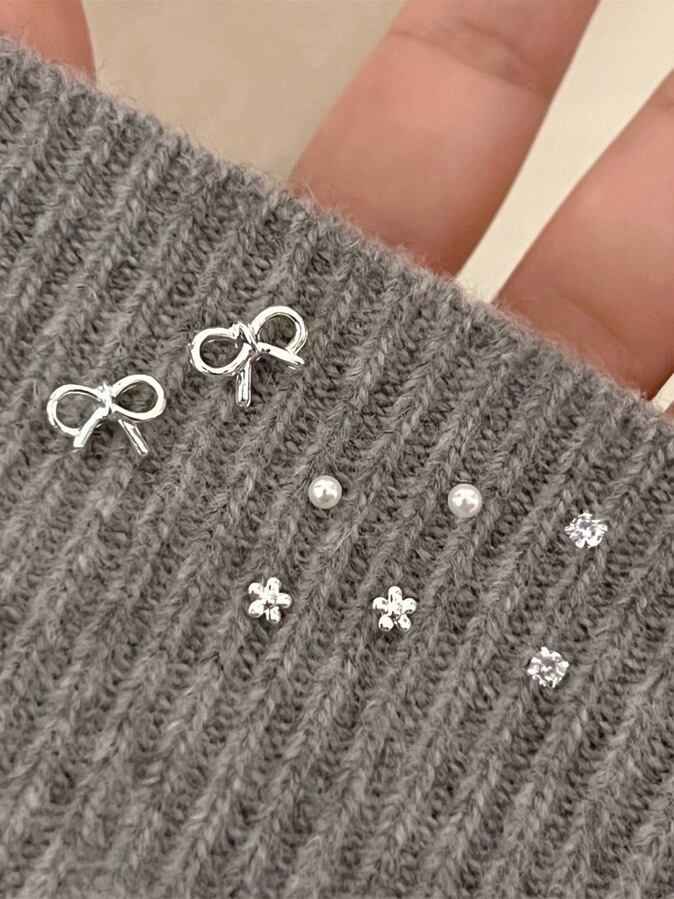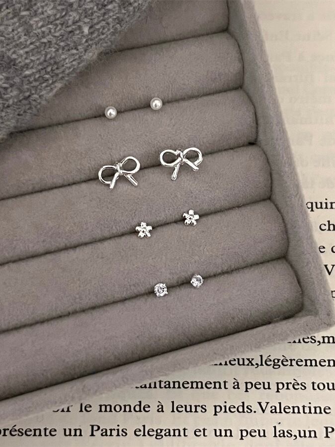 リボンや小花モチーフのシルバーで統一されたセットピアスです。